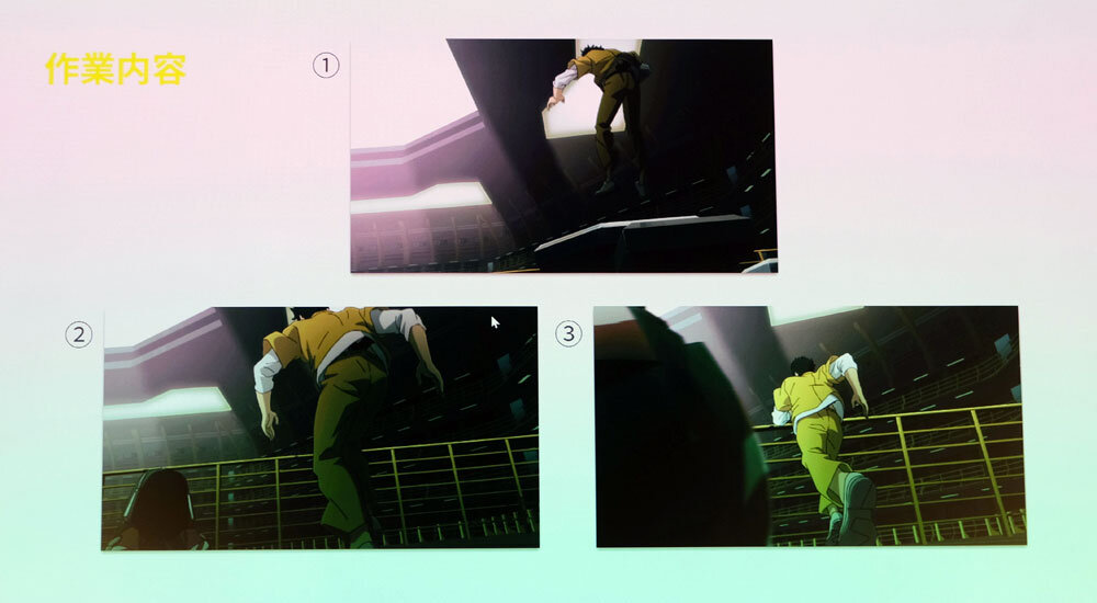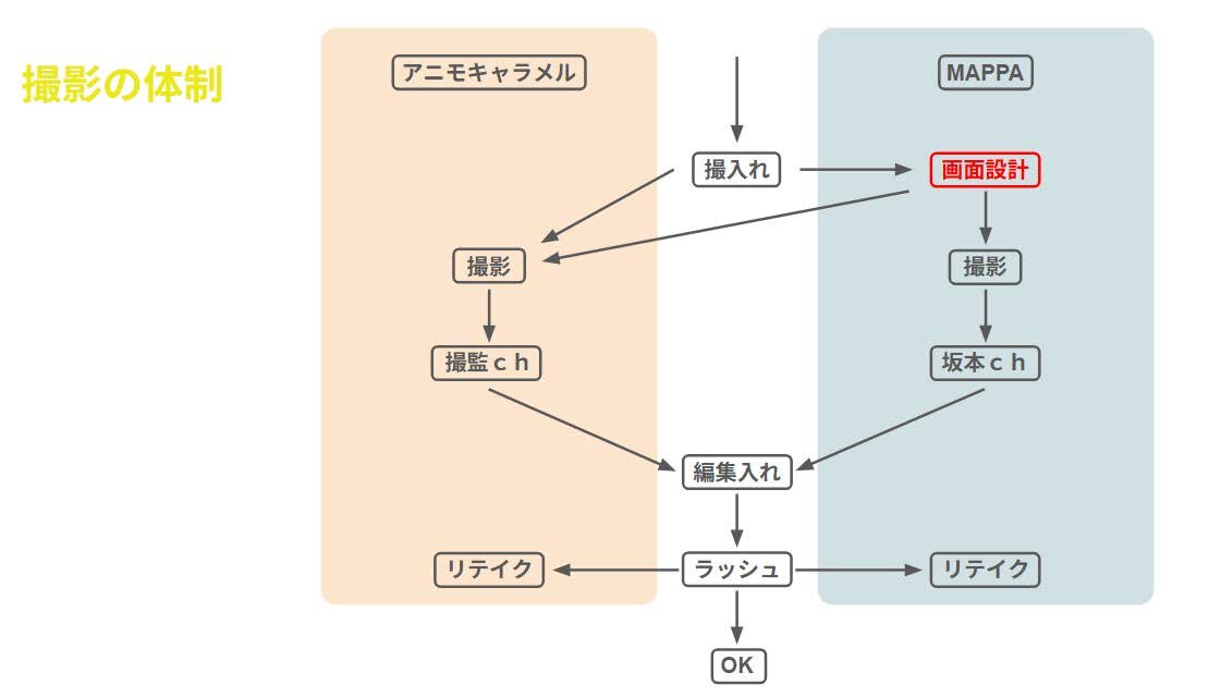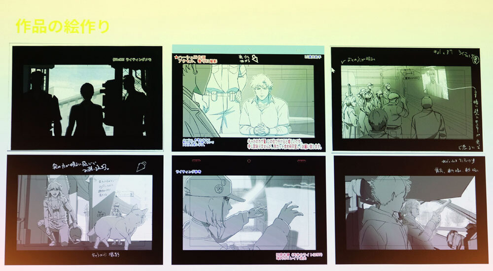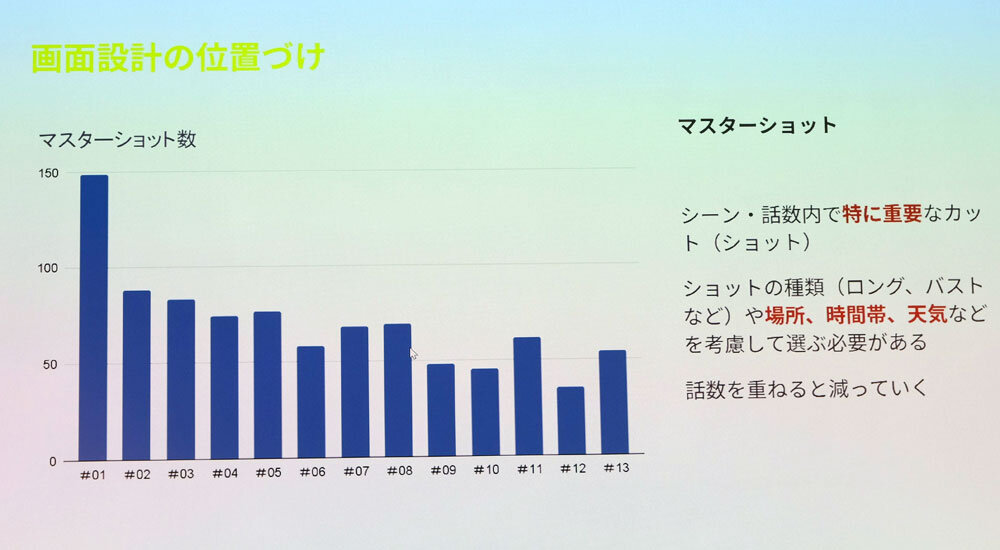 結果的に第1話はマスターショットが全体の半分弱の150カットに達した。後半の話数になるほど既出シーンが多くなるため、最も少ない話数では30カット程度まで減らすことができた。