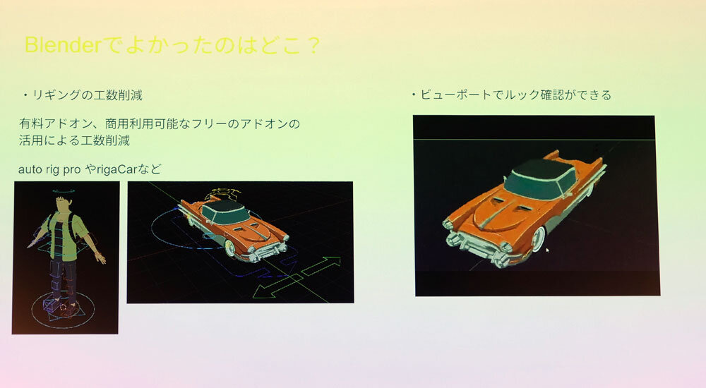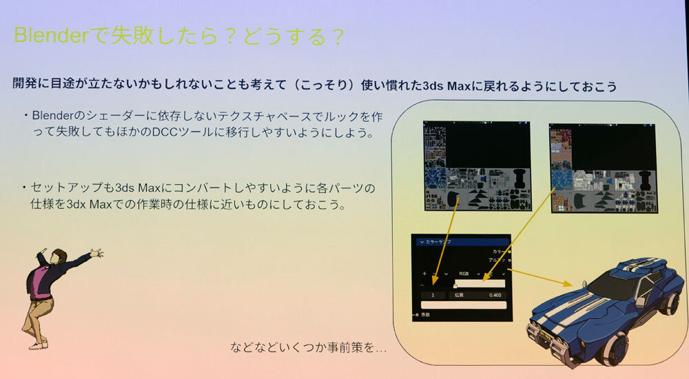 これは、「結果が芳しくなければレイアウトはBlenderで進めるがアニメーションは3ds Maxに戻す」という保険をかけるためで、ルックに関してもシェーダではなくテクスチャをベースに開発を進めるなど、3ds Maxにコンバートしやすい仕様を選んだ。セッションでは淡輪氏が「ものすごくビビりながらやっていましたよね」と苦笑する場面もあり、Blenderへの移行が慎重に進められたことが伝わってきた。