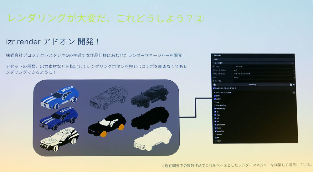 また、レンダリングはプロジェクトスタジオQの主導で、『LAZARUS』仕様に合わせたレンダーマネージャー「lzr render」が開発された。レンダリングしたい素材を選択すれば、指定フォルダに素材が格納されるしくみとなっている。加えて、本アドオンをもとに開発チームが新たなレンダーマネージャーを制作するなど、ほかの作品にも活用が進んでいる。