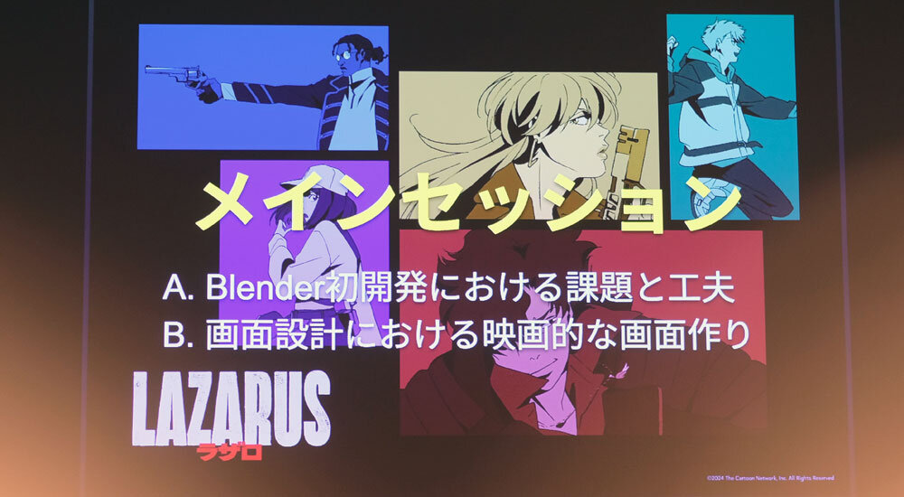 MAPPAによるセッションには、2025年4月~6月に放送された『LAZARUS ラザロ』(以下、『LAZARUS』)の制作スタッフより、CGIプロデューサーの淡輪雄介氏、画面設計の坂本 拓氏、3DCGアニメーションディレクターの渡辺大貴氏、3DCGモデリング/セットアップの石田たまき氏が登壇した。セッション前半ではBlender、後半では画面づくりをテーマに、制作工程を解き明かした。なお、本作ではメインキャラクターは3DCGで制作していないことから、解説はモブキャラクターや車両、背景動画が中心となった。