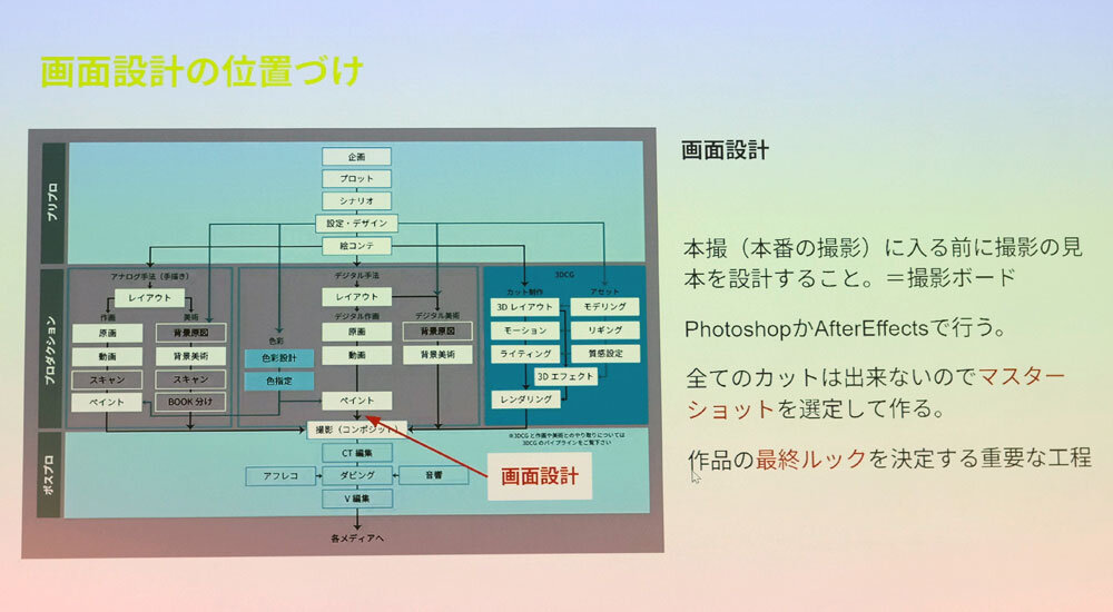 セッション後半は、「画面設計における映画的な画面づくり」と題し、坂本氏が画面設計のノウハウを解説した。画面設計は本番の撮影に入る前に、完成イメージを共有するための撮影ボードを制作する仕事である。