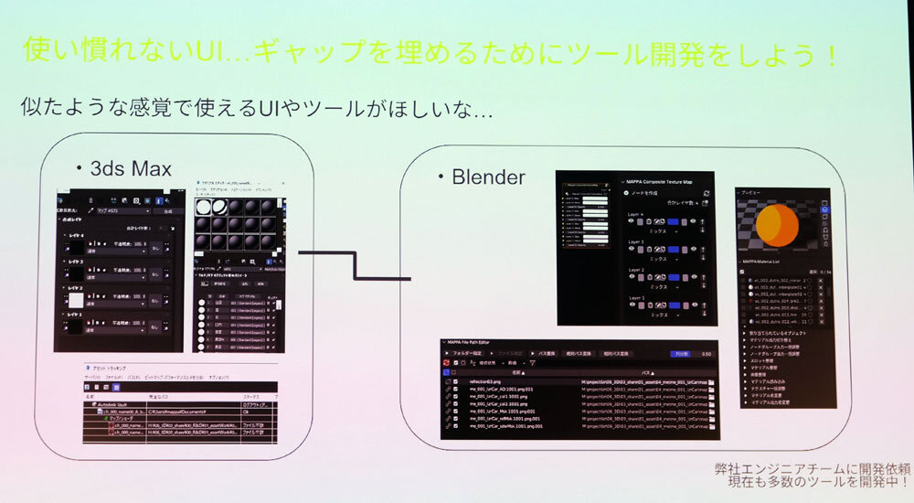 制作中には「マテリアルエディタやアセットトラッキングなど、3ds Maxにある機能をBlenderで使いたい」という要望があがった。そこで開発チームに依頼して、機能を補うツールを制作。足りない機能を自社ツールで埋めるというながれが、その後の社内開発にもつながったという。