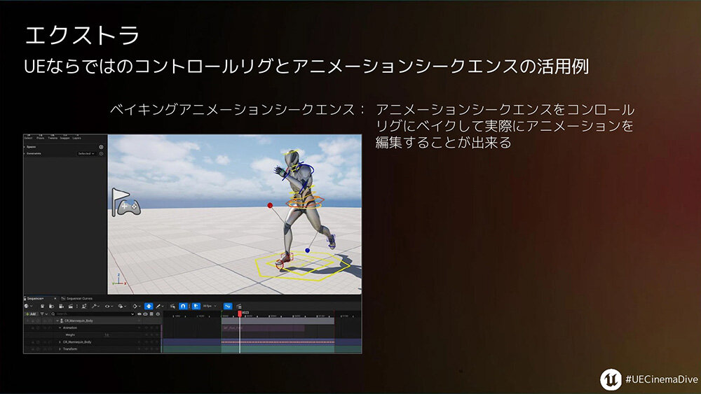 また人型のマネキンを動かす例では、オートキーやフレームレート設定など、シーケンサーのなかの機能をひとつずつ紹介。ミラー機能などのTIPSを交えたり、アニメーションシークエンス同士を重ねると簡易的にブレンドし、そこからさらにリグを調整できるUEならではの機能など、より実践的にUEでアニメーションする方法が紹介された。