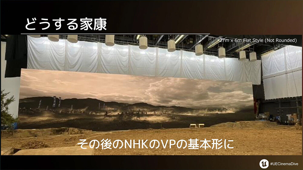 最大横27m縦6mのLEDスクリーンの前に実際のセットを配したICVFX撮影を年間を通して実施し、このプロジェクトで得た知見が、その後のNHKのバーチャルプロダクションの基本形となっている。『どうする家康』では、1年半の撮影の80%以上でバーチャルプロダクションを使用し、UE上のプロジェクト数は119になった。
