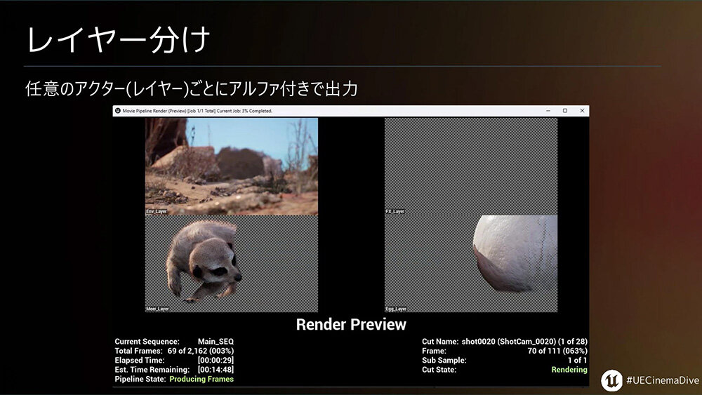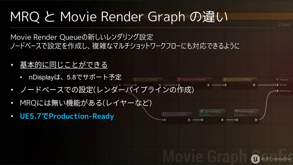 イベントは、まずエピックゲームズジャパンSenior Solutions Architectの向井秀哉氏より開会のあいさつと、「MRQからMovie Render Graphへの移行ガイド」として、UE5.4より新たに登場した機能「Movie Render Graph(MRG)」についての解説が行われた。「Movie Render Graph」は、UE4より実装されている「Movie Render Queue(MRQ)」の新しいレンダリング設定で、ノードベースによってレンダーパイプラインなどの作成が可能となる。UE5.7よりプロダクションレディとなっている。