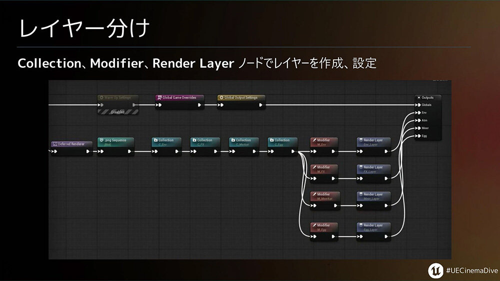MRGで大きく変わった点として、より柔軟に各アクターのレイヤー分けが可能になったことが挙げられる。レイヤー分けに使用するのは、「Colleciton」「Modifier」「Render Layer」のノード。このノードを順番につなぐことで、レイヤーで分けた状態で書き出すことができる。