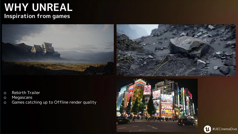 しかし2019年にQuixelが公開したトレーラー「Rebirth」とそのアセット「Megascans」が話題になり、また同時期にStanfeld氏が見かけた、巨大モニターに映し出されたFPSゲームの映像クオリティが高く、自身が長時間かけてレンダリングしていた映像とほぼ遜色なかったことに衝撃を受け、UE4を用いて小規模な実験を始めたという。