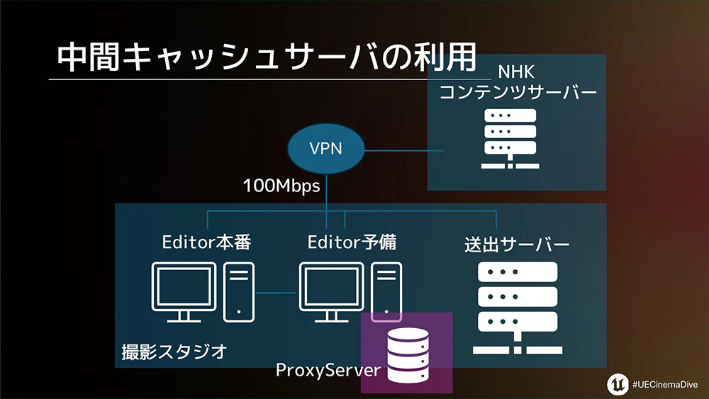 NHKでは、バイナリデータが多いUEと相性が良いということで、UEを使うプロジェクトではバージョン管理ソフトにPerforceが使用されている。PerforceサーバをNHKに構築し、プロダクションだけでなく、撮影スタジオともVPNでつなぎ、コンテンツ制作と運用を一体化してバージョン管理していった。