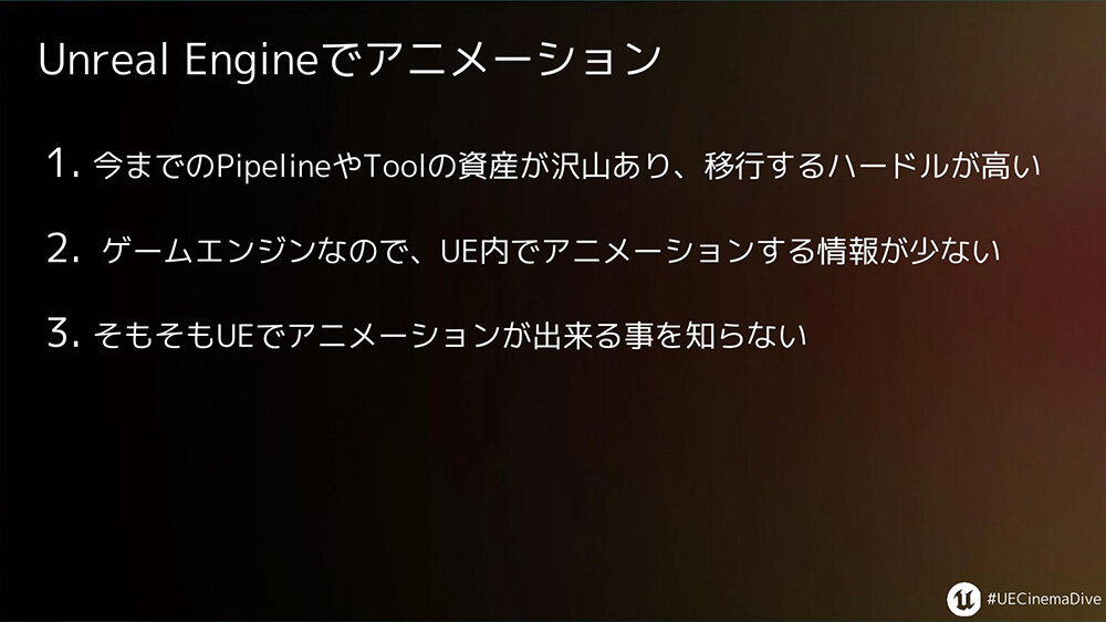 原島氏は現在でこそアニメーションツールとしてUEを採り入れているが、UEではそもそもアニメーションに関する情報が少なかったり、MayaなどのDCCツールとの使い勝手が異なるため、移行するハードルが高いと感じているという。