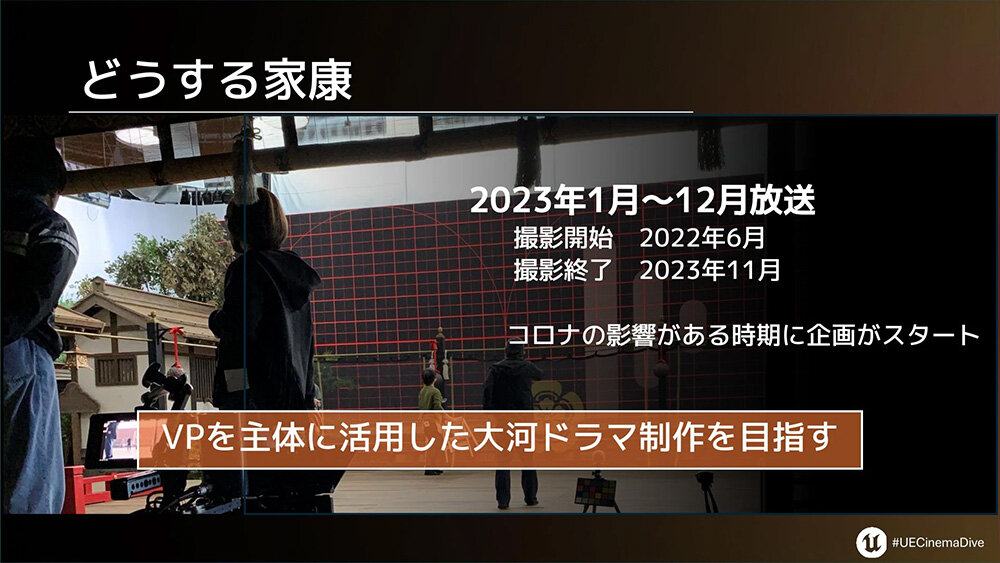 NHKでは、2017年にUEが無料化したことに伴ってUEによるコンテンツ開発がはじまり、2021年からバーチャルプロダクション制作が本格化している。2023年に放送された『どうする家康』はNHK最大のバーチャルプロダクションプロジェクトで、その後のバーチャルプロダクションの全ての基本となった。
