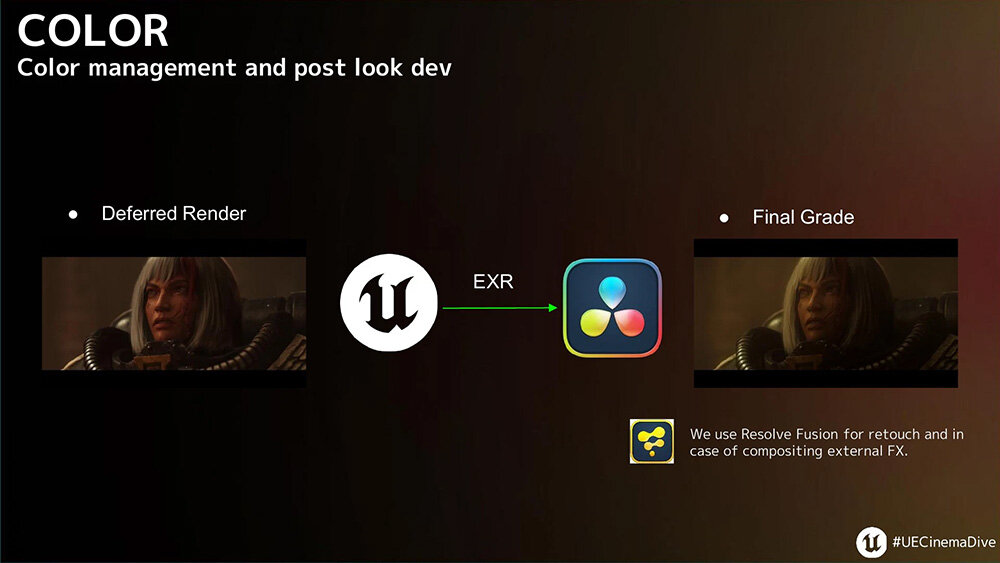 こうした問題の原因は様々で、完全な対応策を見つけることはかなり難しい一方、長編シリーズの制作現場では解決に時間をかけることはできない。M2 AnimationではUEからEXRファイルを書き出してDaVinci Resolveに移し、最終的な処理を行うが、そこで古いフィルムの特性を利用することで、リアルタイムレンダリングの欠点に対処しているという。