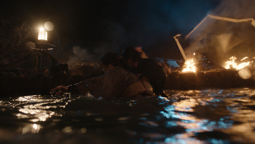 逃げる2人をハンディで追っていくシーンは長回しのカメラワークになっており、その間に火矢が刺さる者や斬られる者が次々と出てくるという、大阪チームが手がけた最高難度のVFXショットとなっている。このシーンでも3Dスキャンによって作成されたデータを基にトラッキングデータが作成され、実写プレートに合わせた火矢の軌跡や炎が合成されていく。
