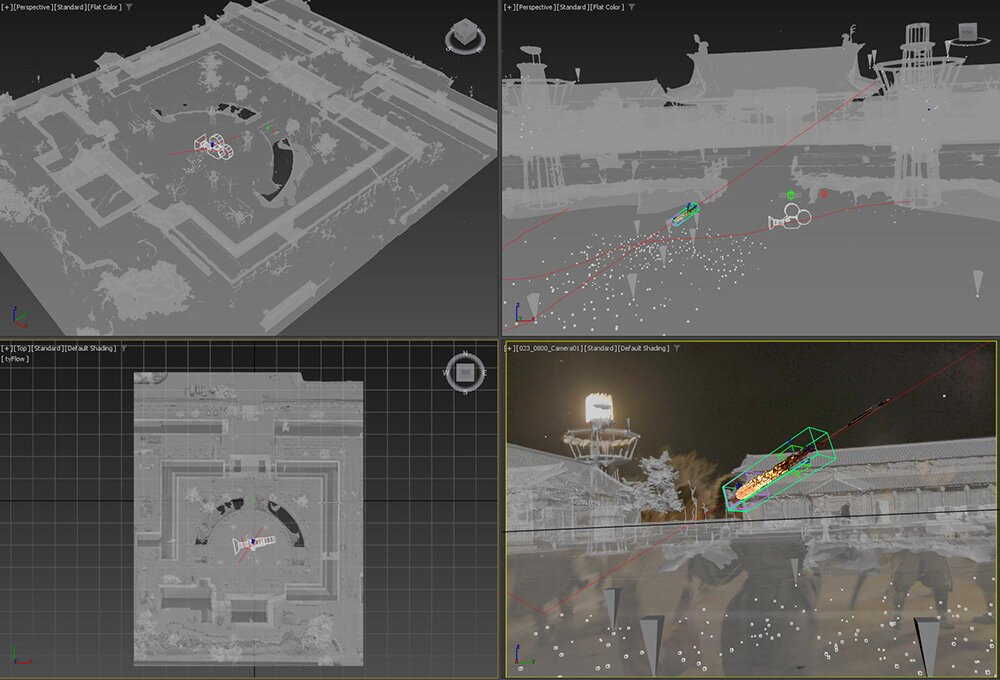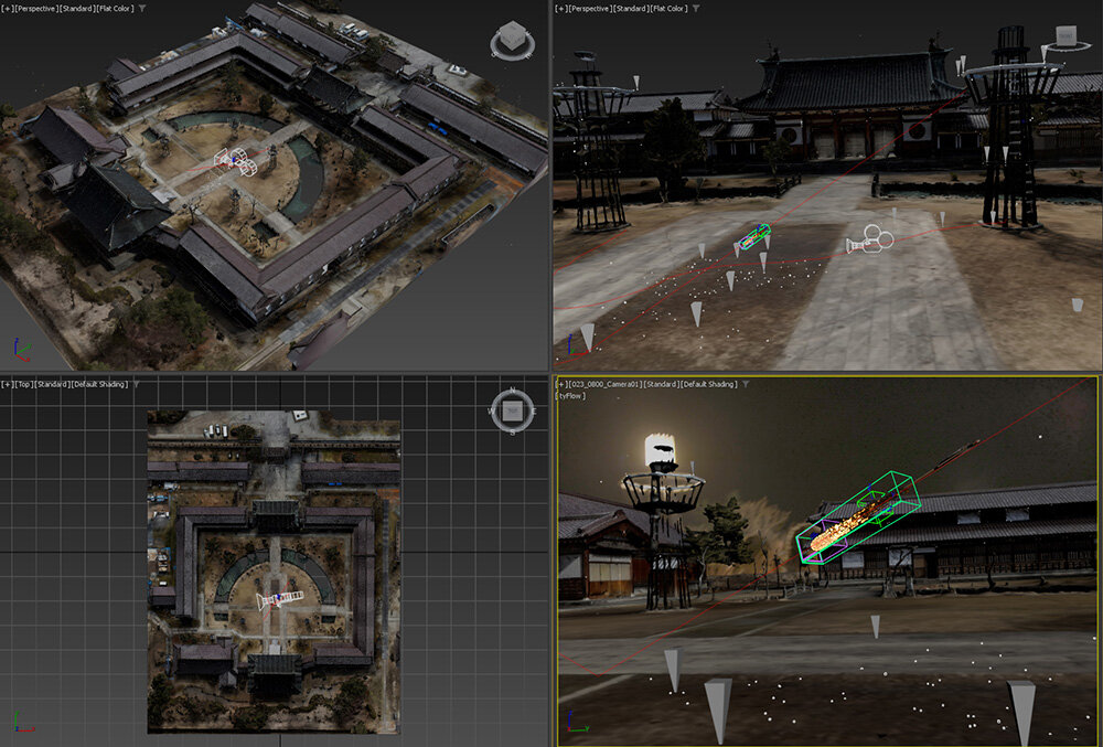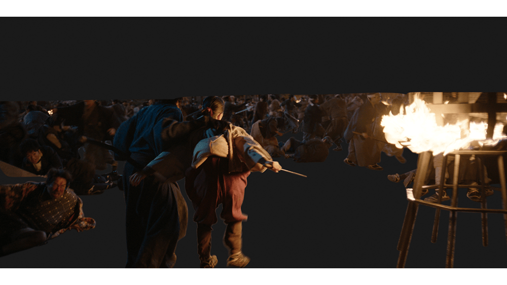 天龍寺境内で行われている戦いを真俯瞰から捉え、旋回しながらカメラが引いていく印象的なシーン。予告映像にも用いられているこのシーンでは、主要キャラクターの武骨が中心におり、その斬り合いの激しさが同心円状に広がっていく様が表現されている。高精度なトラッキングデータによって、ぶつかり合う刀の輝きをはじめ、地面の汚れや松明の炎が綺麗に合成されている。