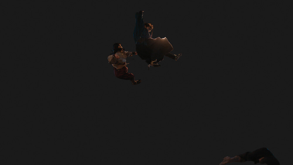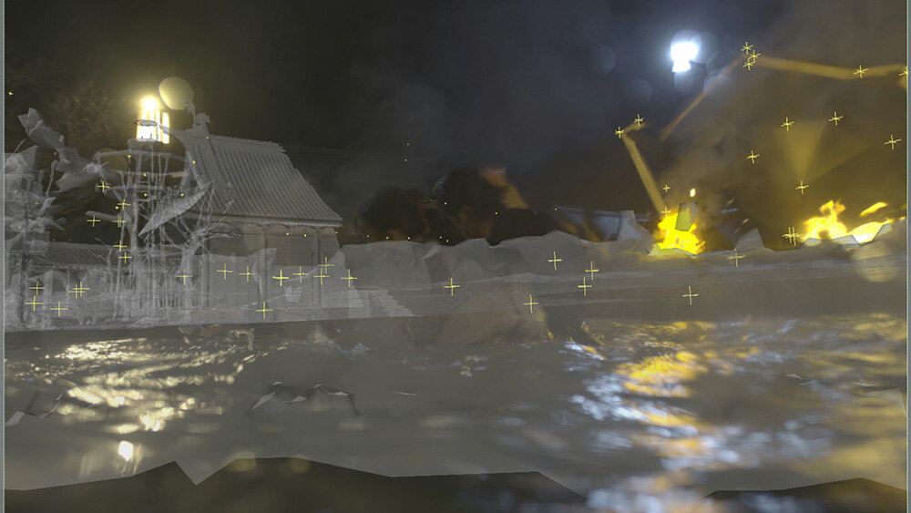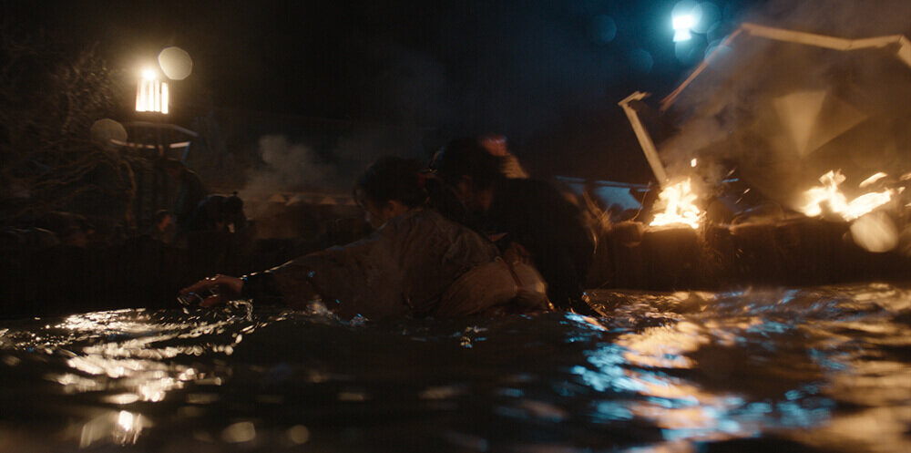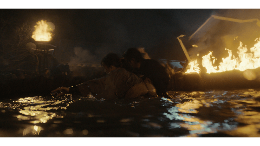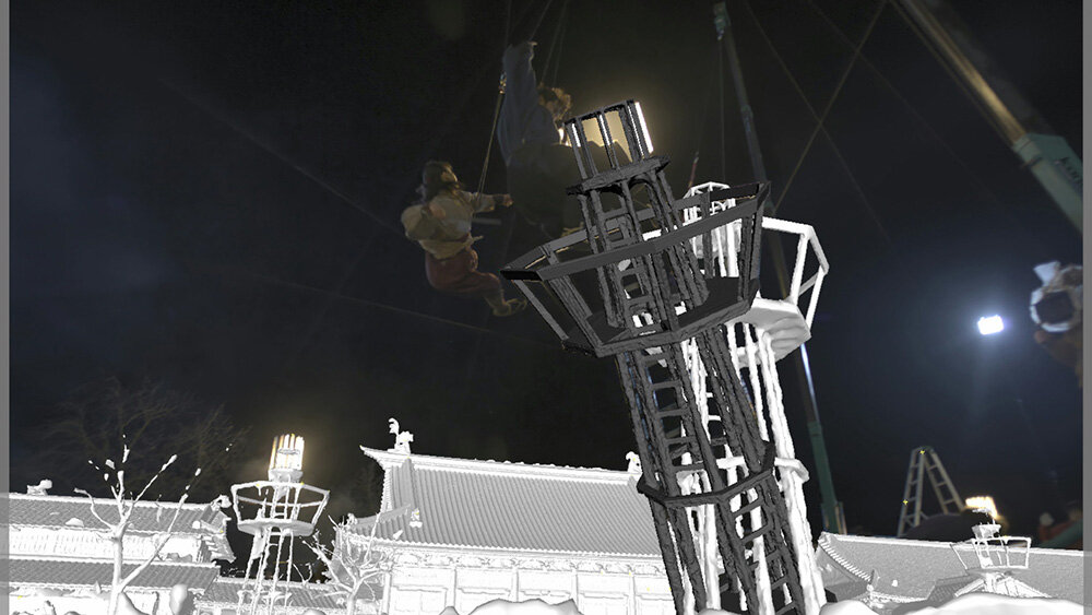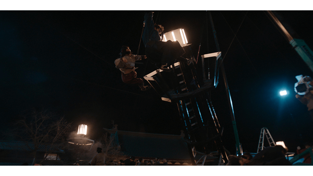 櫓が倒れて2人が池の中に落ちるカット。役者2人は櫓の美術セットに乗って演技し、ワイヤーアクションで池の中に落ちるように撮影。倒れる櫓は、破壊シミュレーションを施したCGに置き換え、飛び散る手すりなどが合成される。そのため、3Dスキャンしたデータを利用してプレートに対して高精度のトラッキングを施していく。また天龍寺のシーンでは多くの撮影や照明機材があり、それらのバレ消しのため大量の人物マスクが作成されている。合成時にはアクションのスピード感やメリハリを表現するため、部分的にリタイムして速度調整を行なっているショットもあるという。