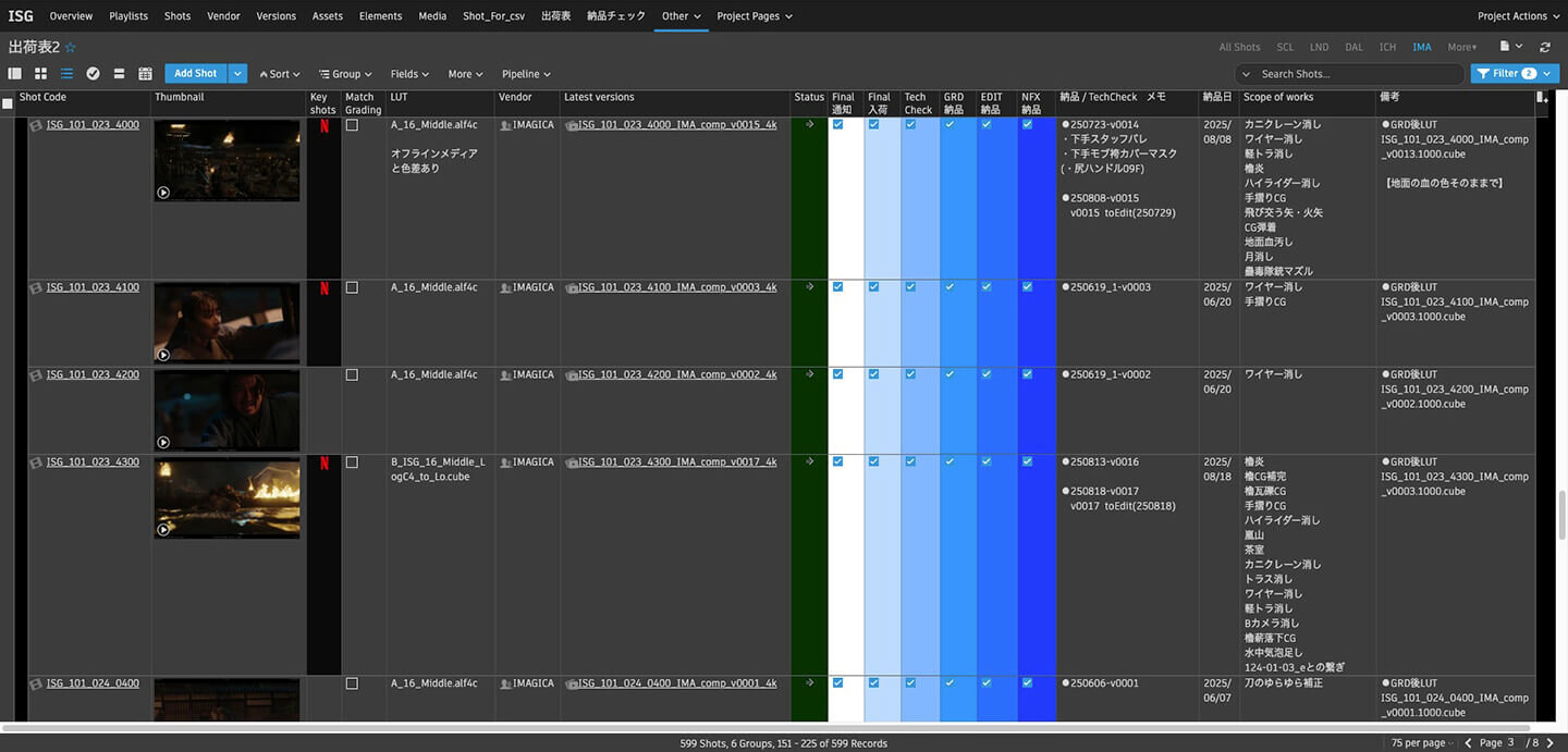 本作ではPMが全カットの撮影帯同を行い、各ショットの詳細なデータが記録されている。