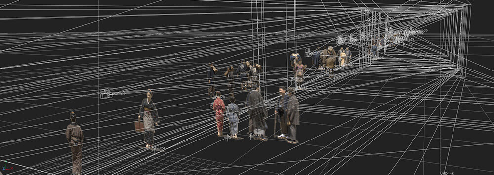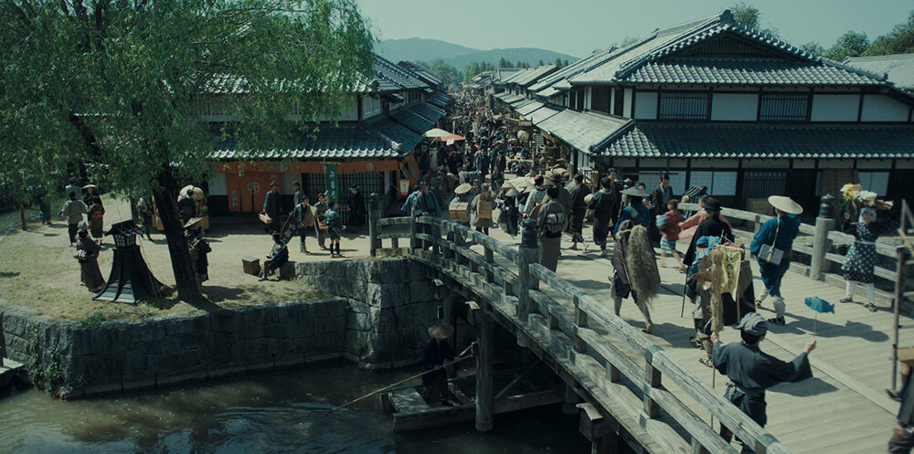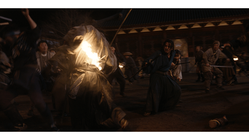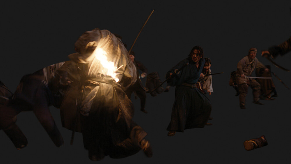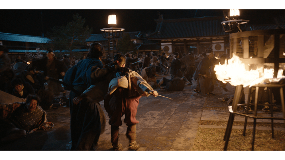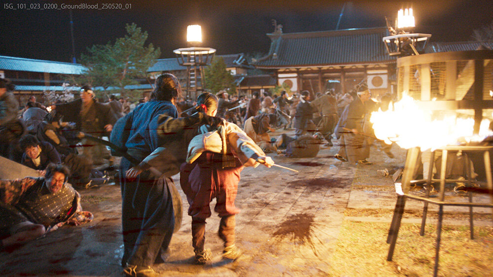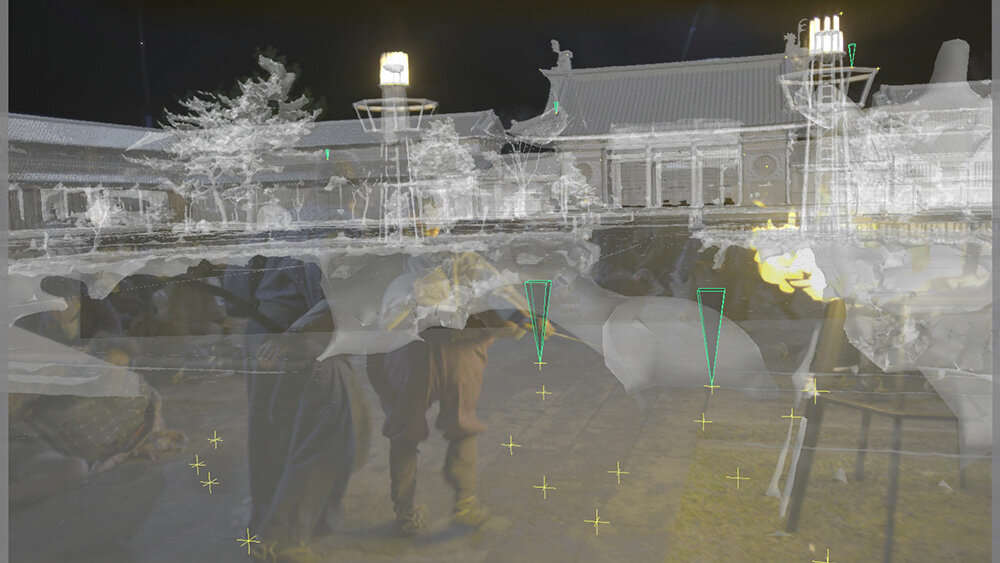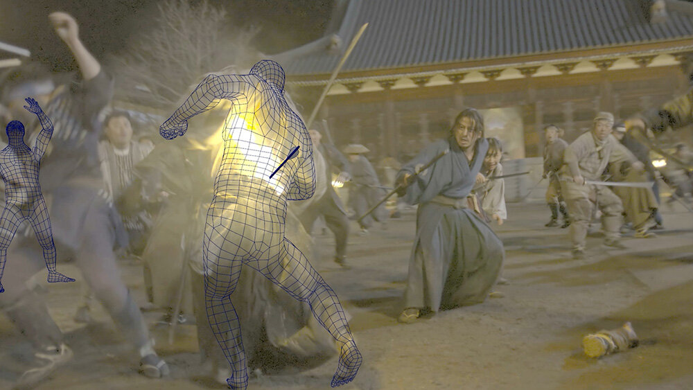 このトラッキングデータを使用することで、天龍寺のような現場を汚すことができない重要文化財での撮影であっても、血飛沫や地面の汚れなどをVFXで合成することが可能になっている。また、宿場町の街並みの多くは実写素材に対してフルCGによるセットエクステンションが施されており、リアルな明治時代の景観が再現されている。