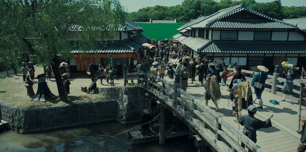 京都の街中はオープンセットの抜け部分に大きなグリーンバックを配置して撮影し、CGで置き換えられている。