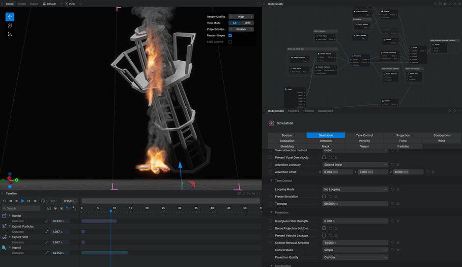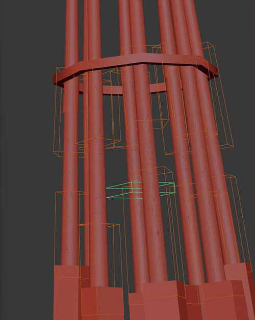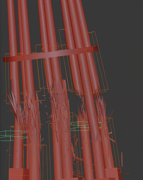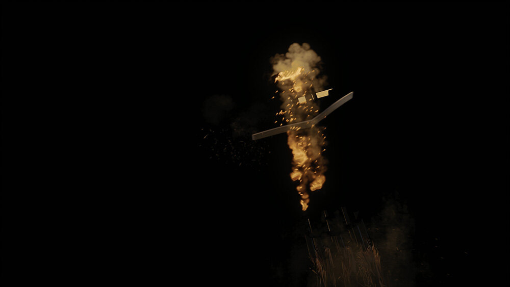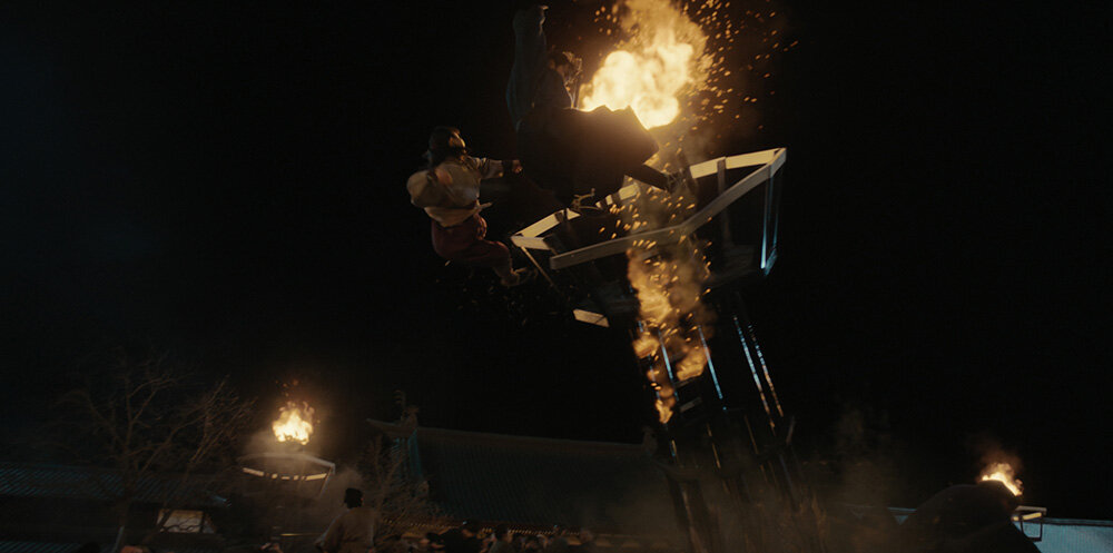 崩壊する櫓は、3ds MaxのtyFlowを使って作成されている。役者2人は撮影時に手すりがない状態で投げ出されていることもあり、櫓が崩壊する様子を自然に見せるのは難度が高かった。そのため、壊れた脚部が飛び散り方に見えるよう、完成まで10バージョンほど何度も試行錯誤が重ねられた。また、櫓の炎や境内にある松明の炎は主にEmberGenを使って作成されている。