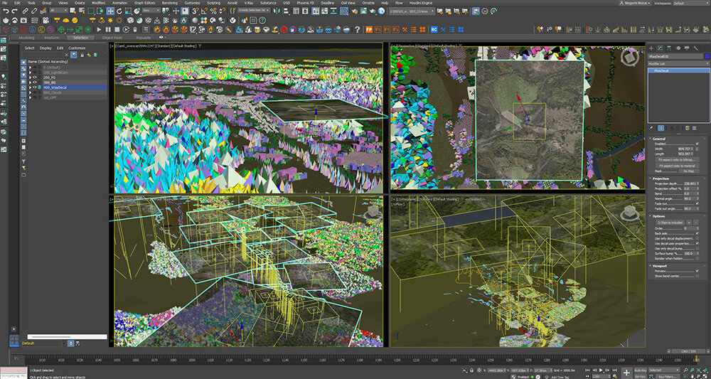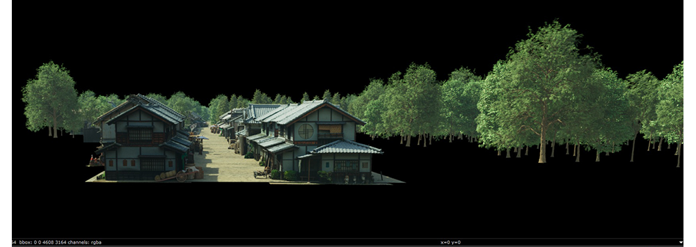関宿は自然物が多く、データ量をいかに軽量化するかがポイントになったという。そこでV-Ray Decalを使って写真素材を地面に貼り付け、その上に樹木を生やすなどして軽量化が図られた。