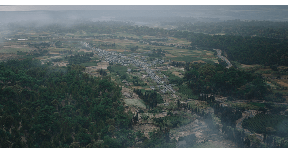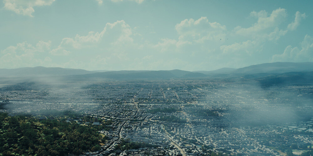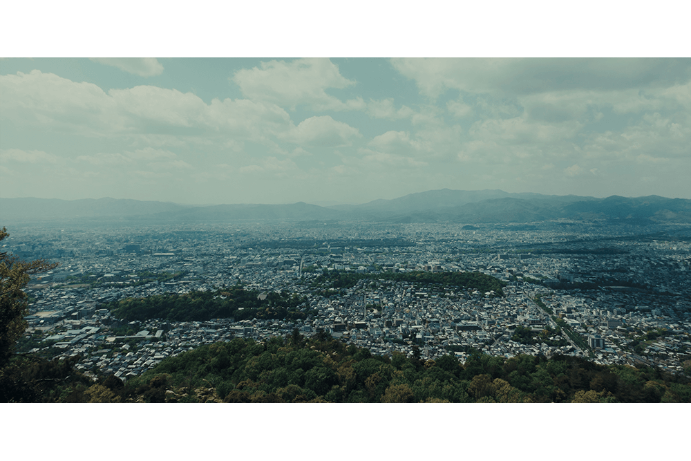 京都の空撮は、山並みをフライスルーする部分はドローン撮影、街並はフルCGで作成。ルックは京都にある大文字山の山頂から見た嵐山方向の情景をリファレンス撮影し、ACESカラースペースに撮影素材を読み込みLUTをあて、CG側の色味も調整されている。