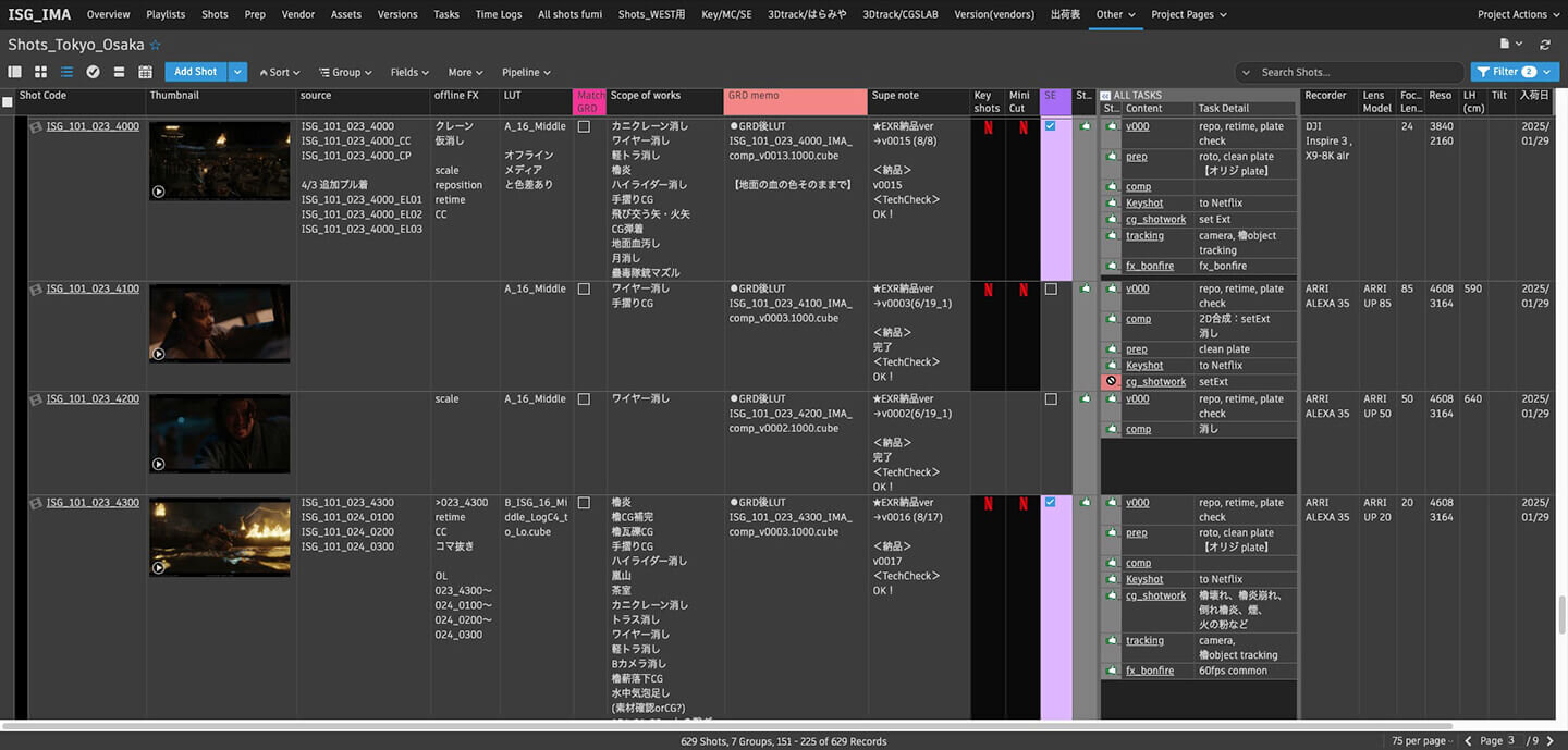 VFX作業は東京と大阪の2拠点で行われており、竹芝メディアスタジオのサーバを拠点に、東京・大阪・京都を10Gbpsの回線で結び、リモートでの作業体制が確立されている。制作管理にはFlow Production Trackingをカスタマイズし、クライアントであるオフィス・シロウズとも共有。制作進行の効率化も図られている。Netflix作品では作業環境におけるセキュリティ要件も非常に厳しいため、世界基準のセキュリティ環境が構築された。
