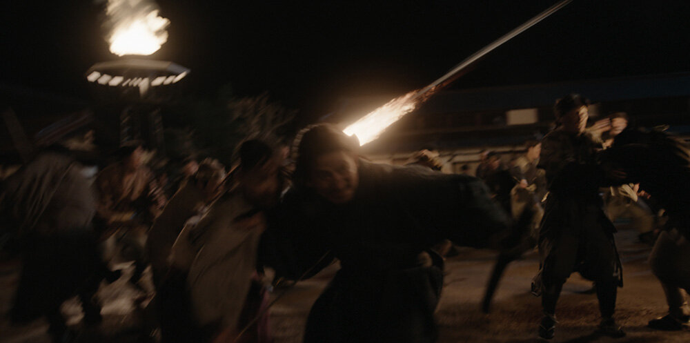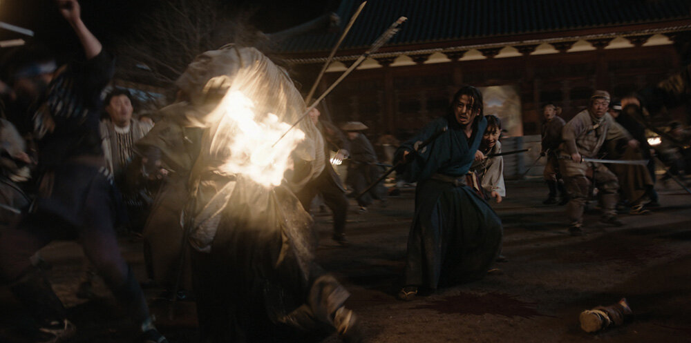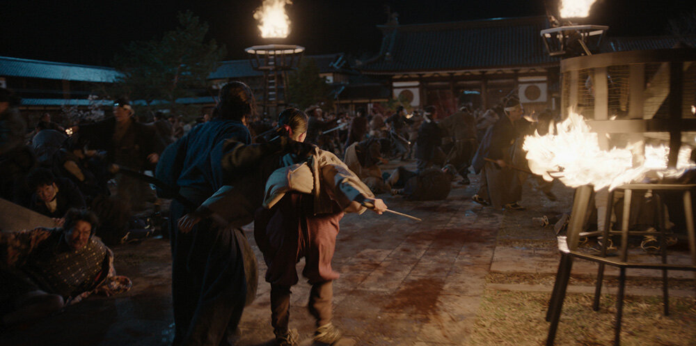 序盤の天龍寺のシーンでは、300人が一斉に斬り合いを始めるという非常に派手で迫力のある乱戦が展開される。300人全てが生身の役者であるため、VFX制作ではその役者たちのアクションを邪魔しないフォトリアルなインビジブルエフェクトが徹底された。一連のシーンにはかなりの流血表現があり、壁や床、役者の衣装が血や泥で汚れている様子が随所に見られる。天龍寺ではそのようなロケーションに手を加えるような行為は全域にわたって禁止されていることもあり、全て合成処理で表現された。