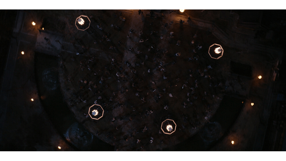 また、夜のシーンであることから映像上では多くの松明が焚かれているが、実際の撮影現場では大きな火の扱いが禁止されているため、4つの大きな櫓の炎は全てVFXによって合成されている。こういった場所の制約に加え、大人数の役者が交錯し、なおかつ長回しをはじめとした複雑なカメラワークが絡む。そこでVFXチームは現場に常駐し、カメラのメタデータや各種ディスクリプションなど、現場での撮影状況の記録管理を徹底することによって、高い品質を保ったVFXショットを可能にしている。