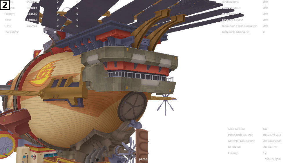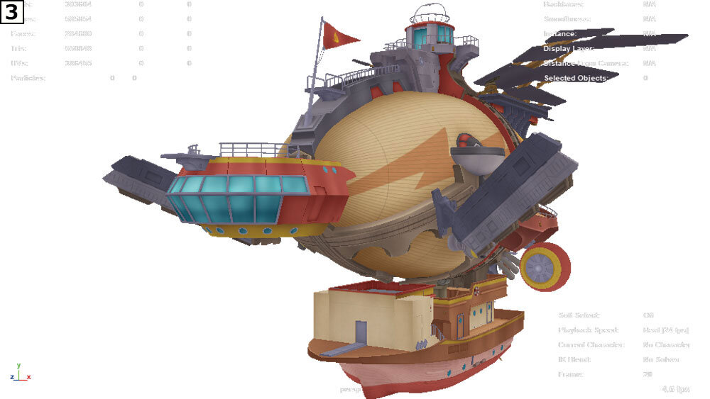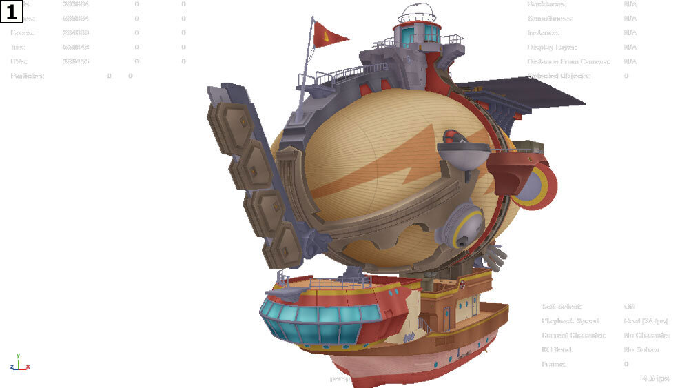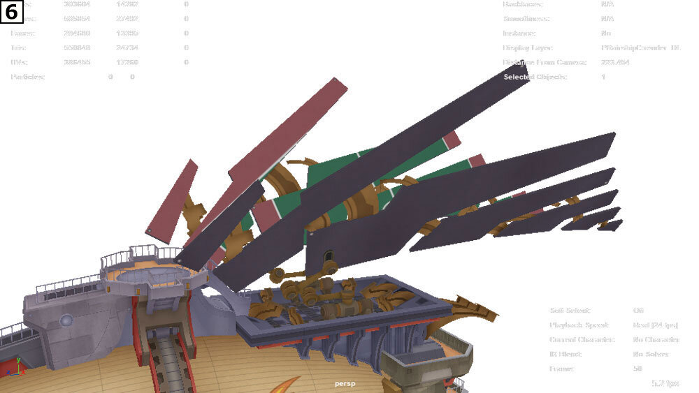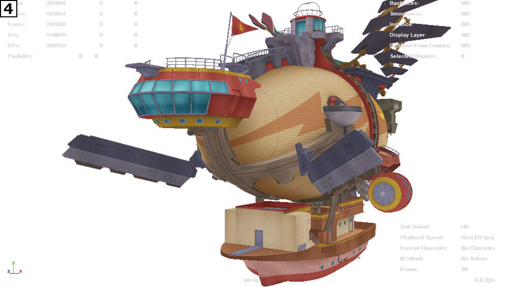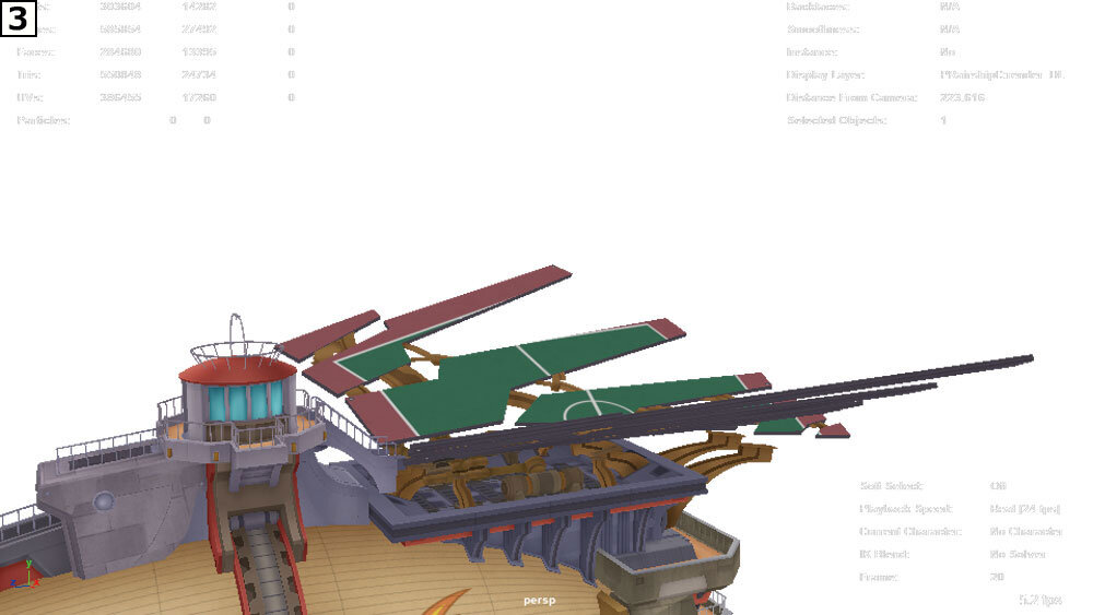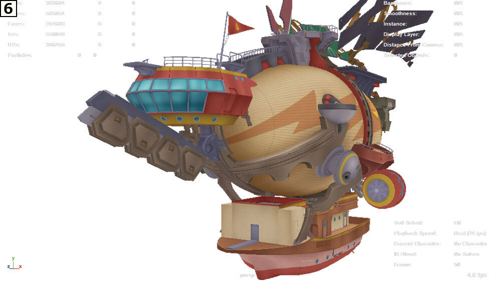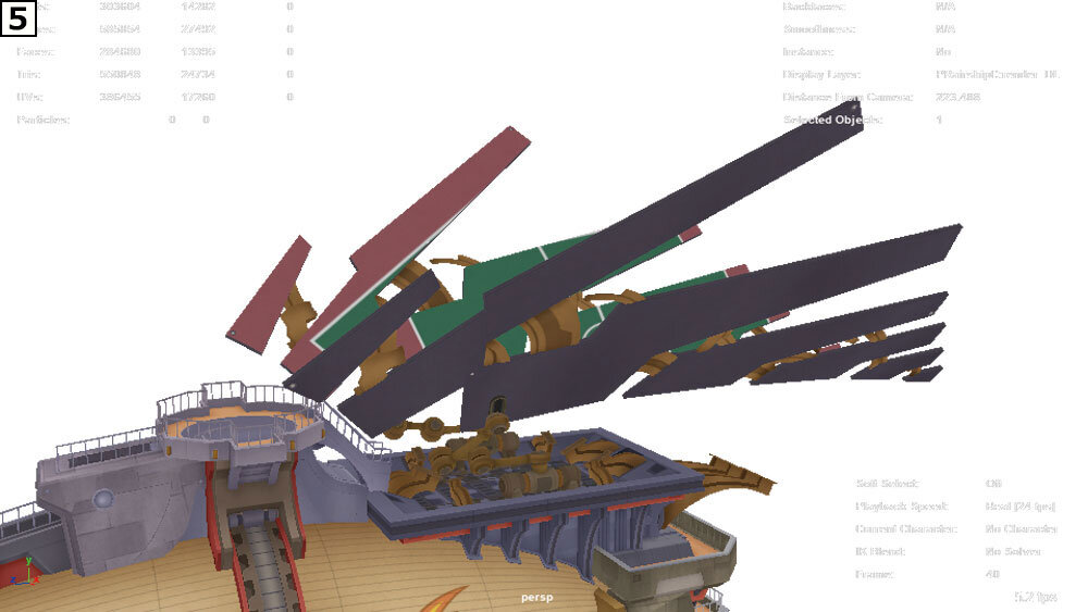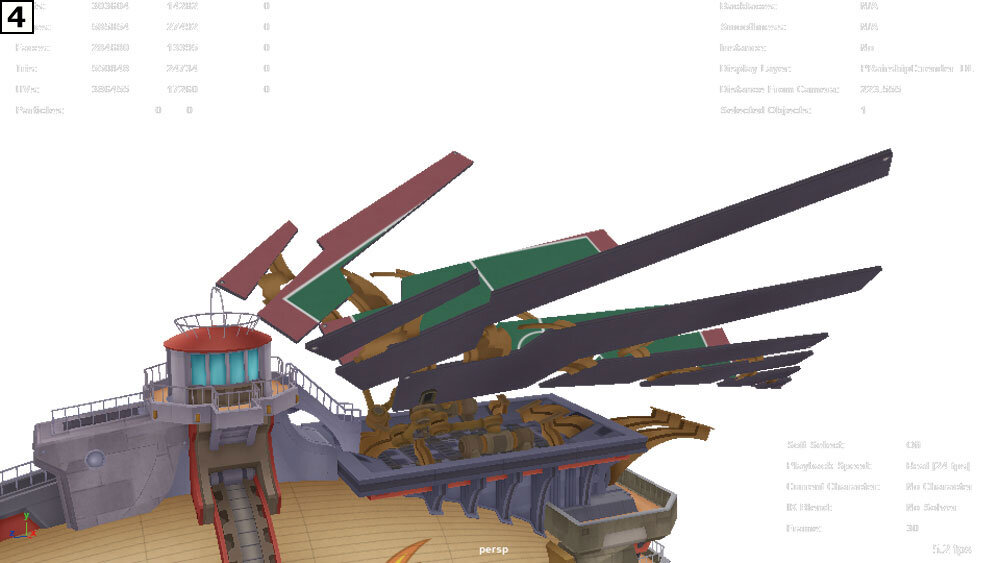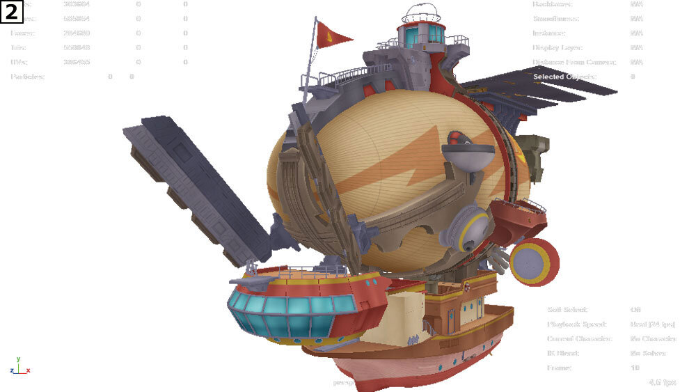 ブレイブアサギ号は変形ギミックも多く、挙動や隠れている部分の整合性などの調整が非常に難しかったという。「全体的にギミックの多い飛行船なので、まずはパーツだけ作成して、動きのイメージを確かめながら詳細なデザインを詰めていきました。最初の設定画からアームの部分を動きやすいようにデザインを変えさせてもらったり、カメラが寄る場所やキャラクターが何回も行き交うような部分はハイディテールになるようにモデリングしています。モデリング期間は1ヶ月ほど。全てのギミックを、整合性をとりながらつくっていくという作業がなかなか大変でした」と、トゥーンモデル・スーパーバイザーの高橋 峻氏は話す。
