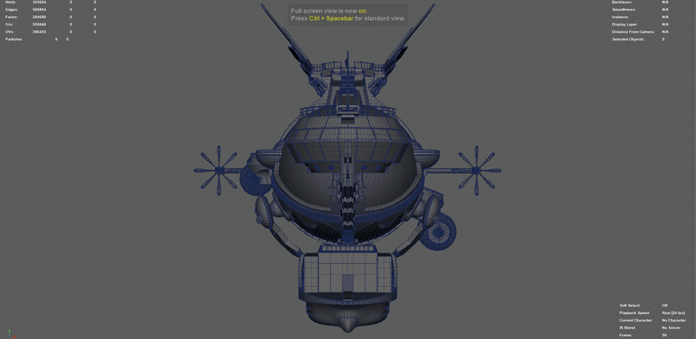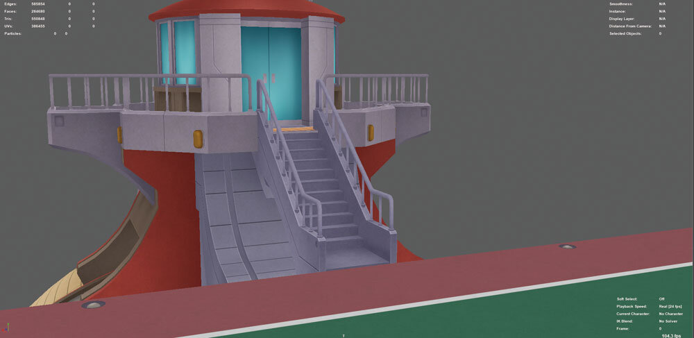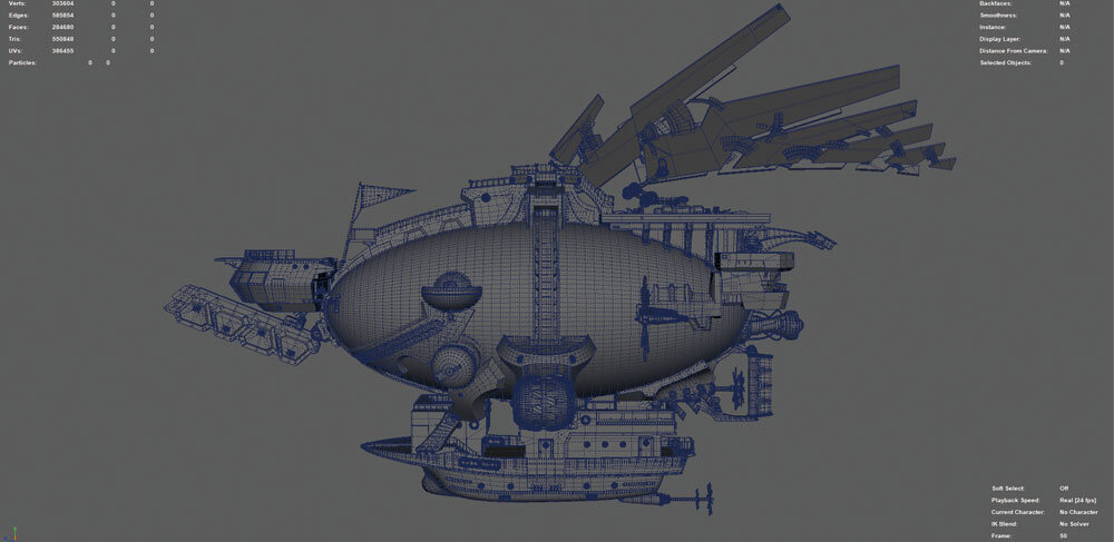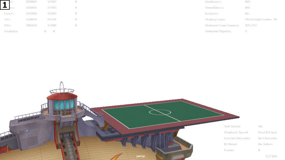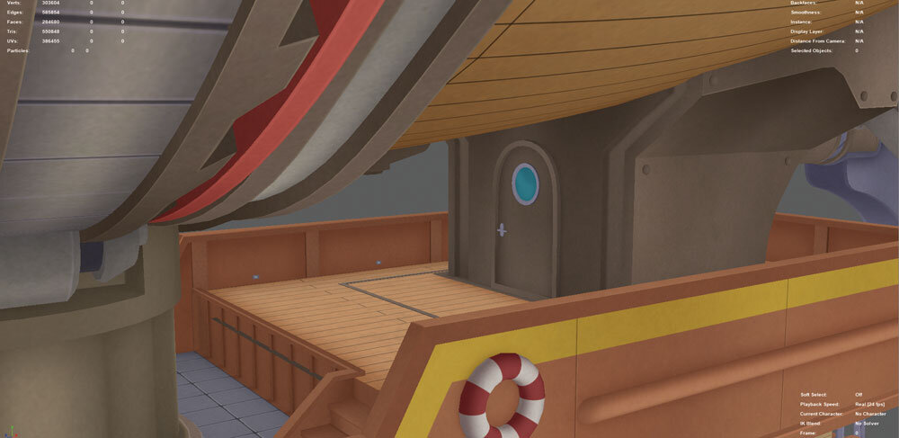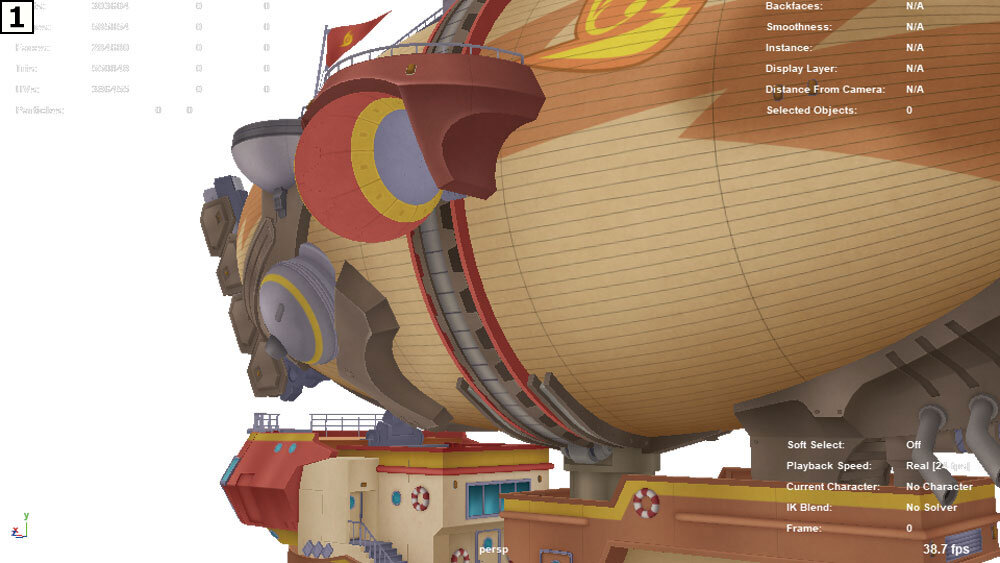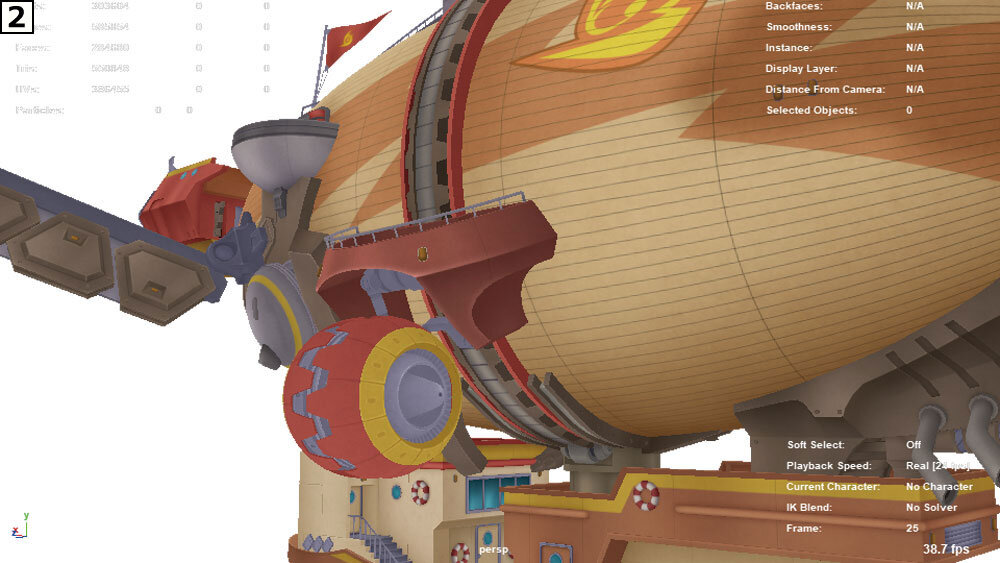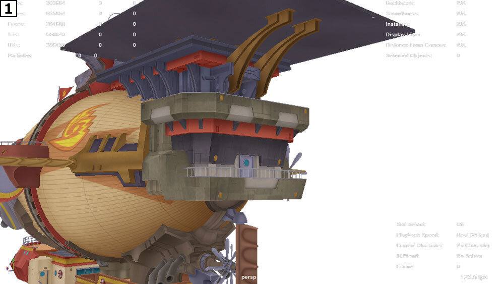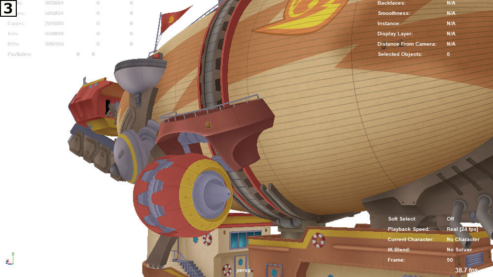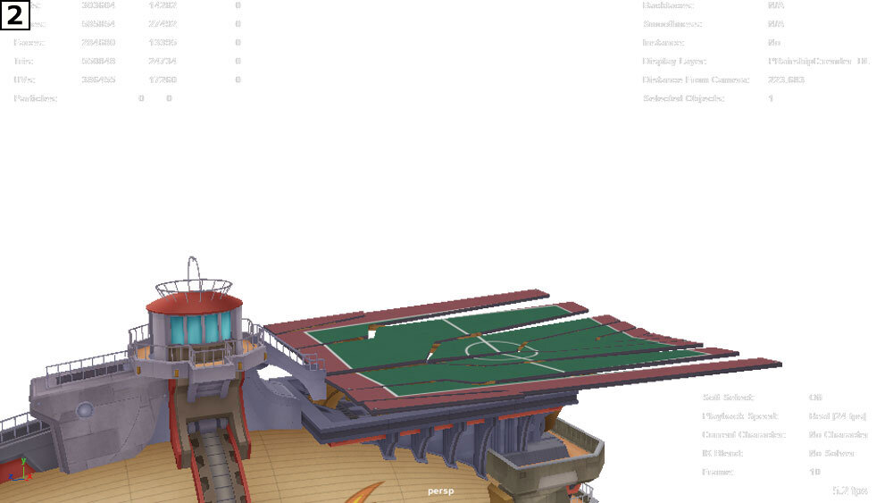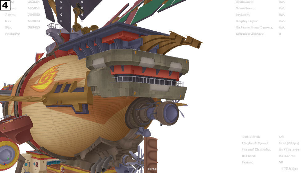 ブレイブアサギ号は変形ギミックも多く、挙動や隠れている部分の整合性などの調整が非常に難しかったという。「全体的にギミックの多い飛行船なので、まずはパーツだけ作成して、動きのイメージを確かめながら詳細なデザインを詰めていきました。最初の設定画からアームの部分を動きやすいようにデザインを変えさせてもらったり、カメラが寄る場所やキャラクターが何回も行き交うような部分はハイディテールになるようにモデリングしています。モデリング期間は1ヶ月ほど。全てのギミックを、整合性をとりながらつくっていくという作業がなかなか大変でした」と、トゥーンモデル・スーパーバイザーの高橋 峻氏は話す。