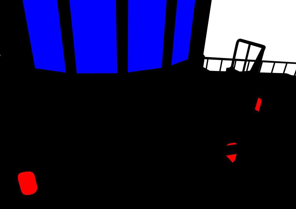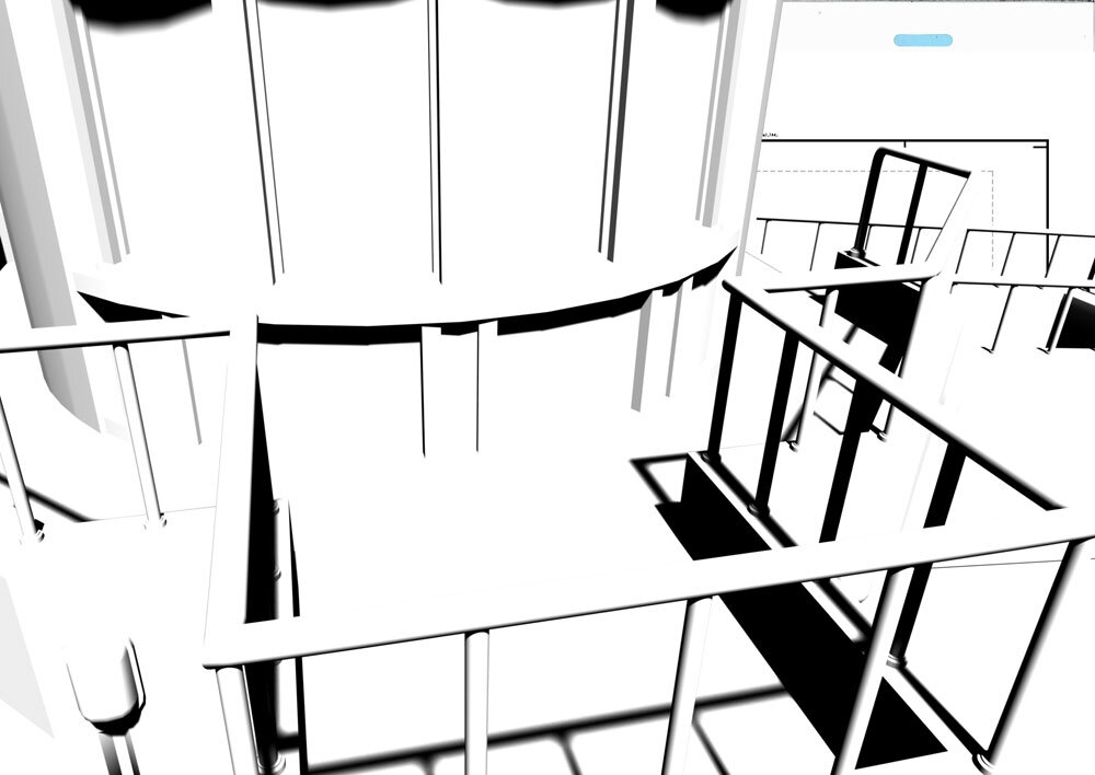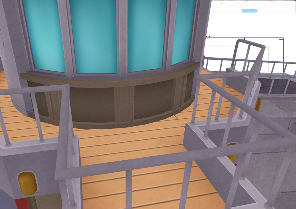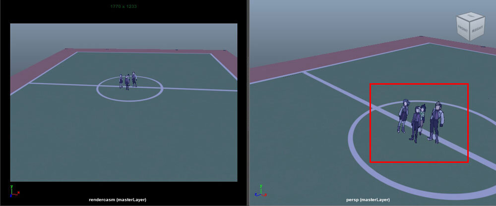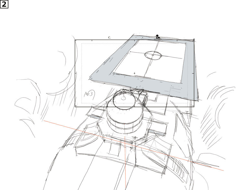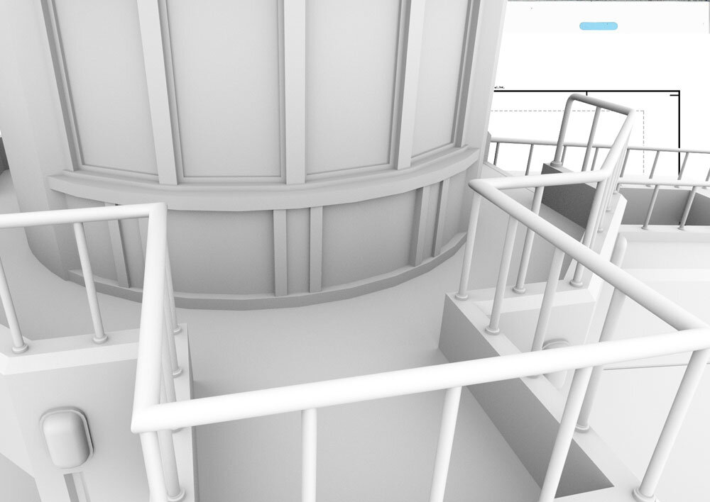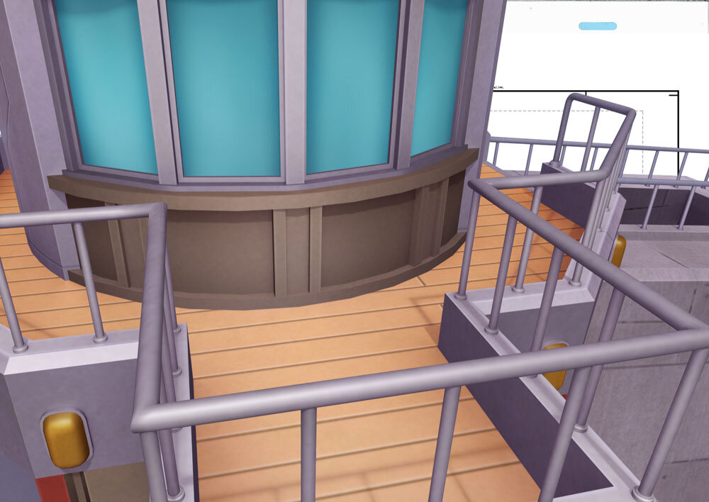 展望室の前にリコとロイ、ポケモンたちがいるカット。このカットでは背景が3Dアセット、手すりに乗っているポケモンを含めキャラクターは作画となっている。このようなカットでは3D先行でまず3Dレイアウトが作成され、それに合わせて作画作業が進められている。3Dが先行する場合は、なるべく画コンテに描かれた構図の意図やパース感のイメージを合わせるように注意しているという。3DレイアウトがOKになったらレンダリング画像を美術側に送り、レタッチしてもらい撮影に回される。