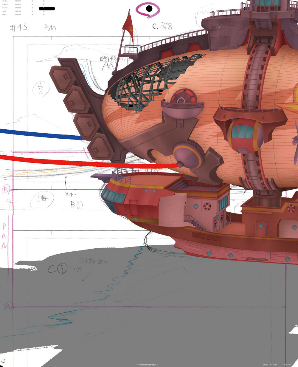 100話に登場する旋回しながら航行するブレイブアサギ号のカット。このように旋回したり、カメラが回り込んだりするカットは、作画コストがかかるため、背景を含めフルCGで制作されることが多い。このカットの背景は天球の3Dアセットに背景素材をマッピングしたものを使用。画コンテはラフな状態だったため、船体の個々の場所をどの程度、どのようにカットの中で見せていくのかを何度も演出側とやりとりをしながら制作が進められたという。
