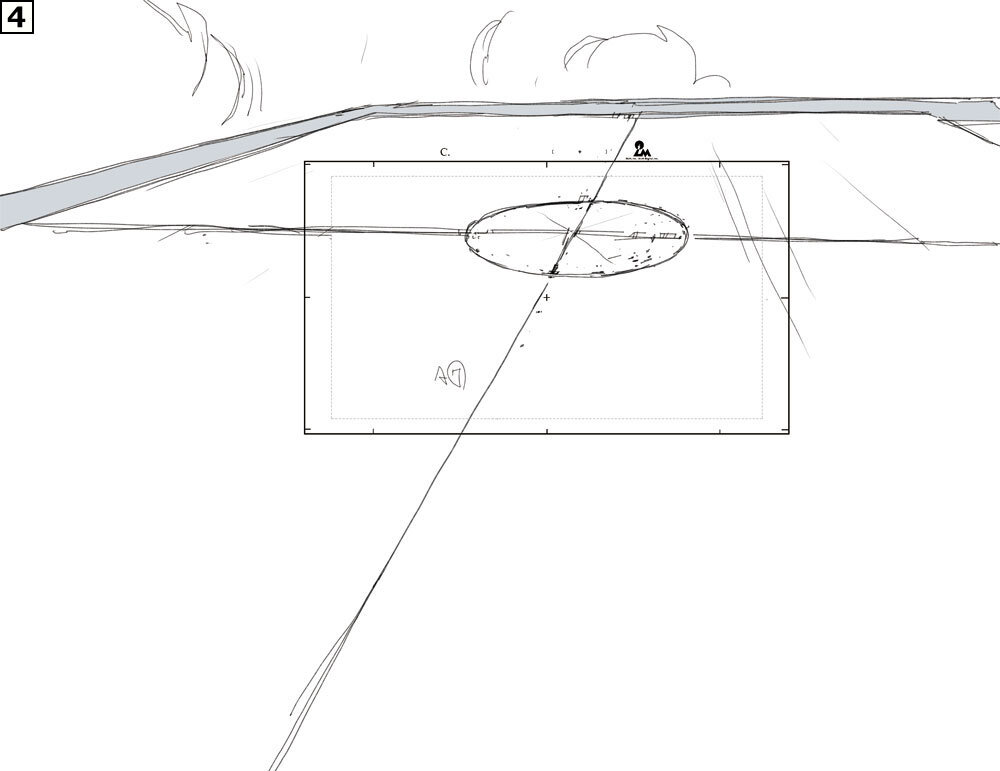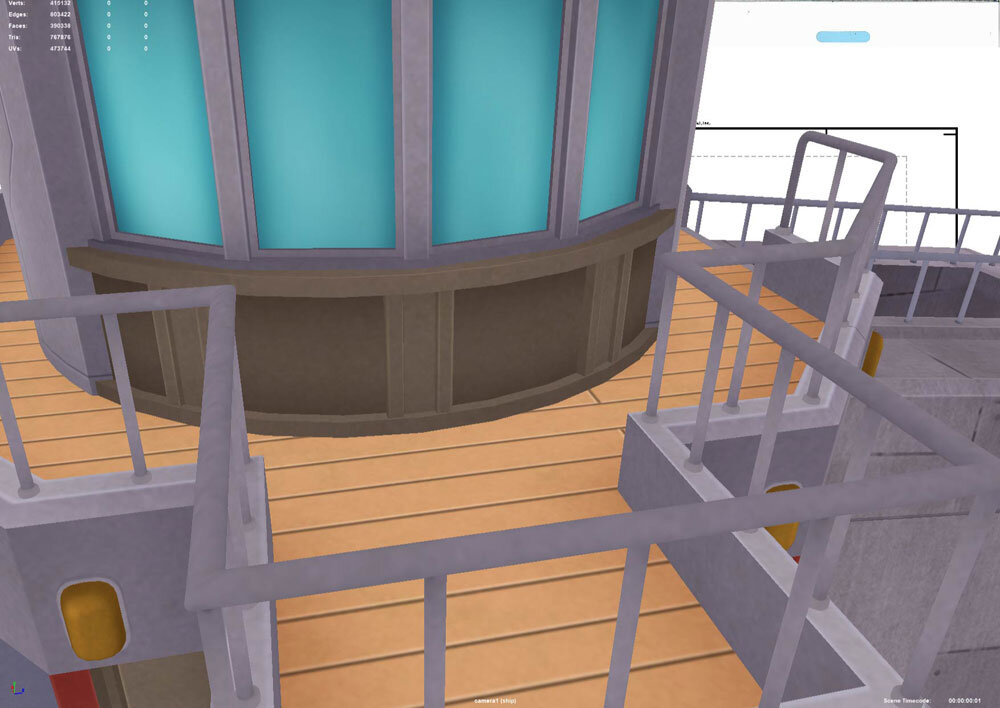 ウイングデッキに立つキャラクターやバリアのエフェクトは平面メッシュに作画素材を貼り込んだ状態になっている。このカットはまず作画で飛来するフリード&リザードンの動きや船体の動きのアタリを作成し、作画に合わせて3Dのカメラワークが付けられている。カメラワークの作業が終わったところで、キャラクターを貼り付けたメッシュを配置。最後にレンダリングと撮影処理を行なって、仕上げられている。