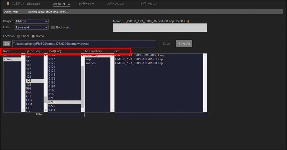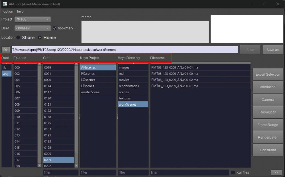 社内開発のオリジナルツール、アセットマネジメントツール「AMtools」は、アセットデータやショットデータの管理をサポートするためのツールだ。データの保存先の指定やデータ命名規則を社内ネーミングルールに従って自動入力できたり、バージョン管理やバックアップなどもルールに沿って自動管理が可能。なお、Mayaだけではなく、AE用も用意されており、撮影側でも同様のデータ管理を行うことができる。