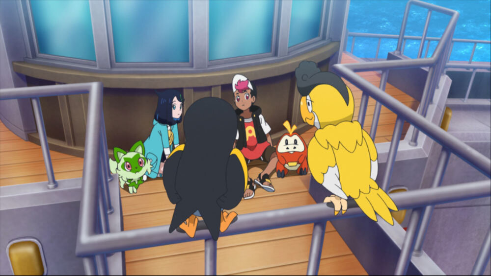 デッキの上のリコとロイ、ポケモンたち