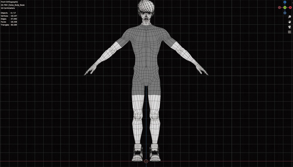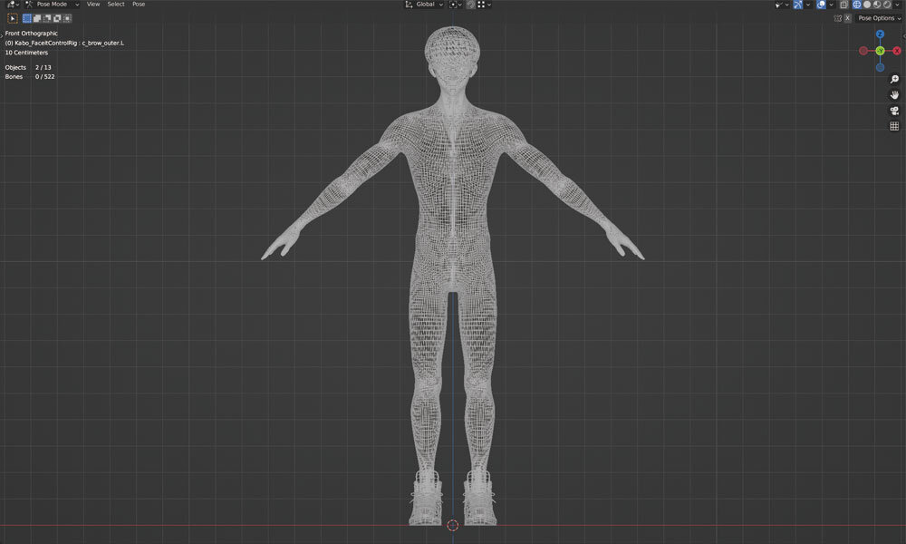 カボのキャラクターモデル。モーションキャプチャ用と、本番レンダリング用の2種類が同時制作された。Tポーズでつくると脇のポリゴンが足りなくなるため、Yポーズでつくられているのが特徴。
