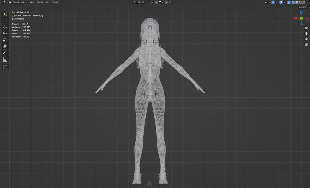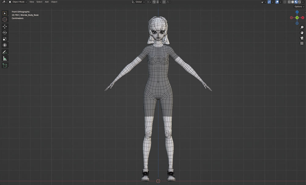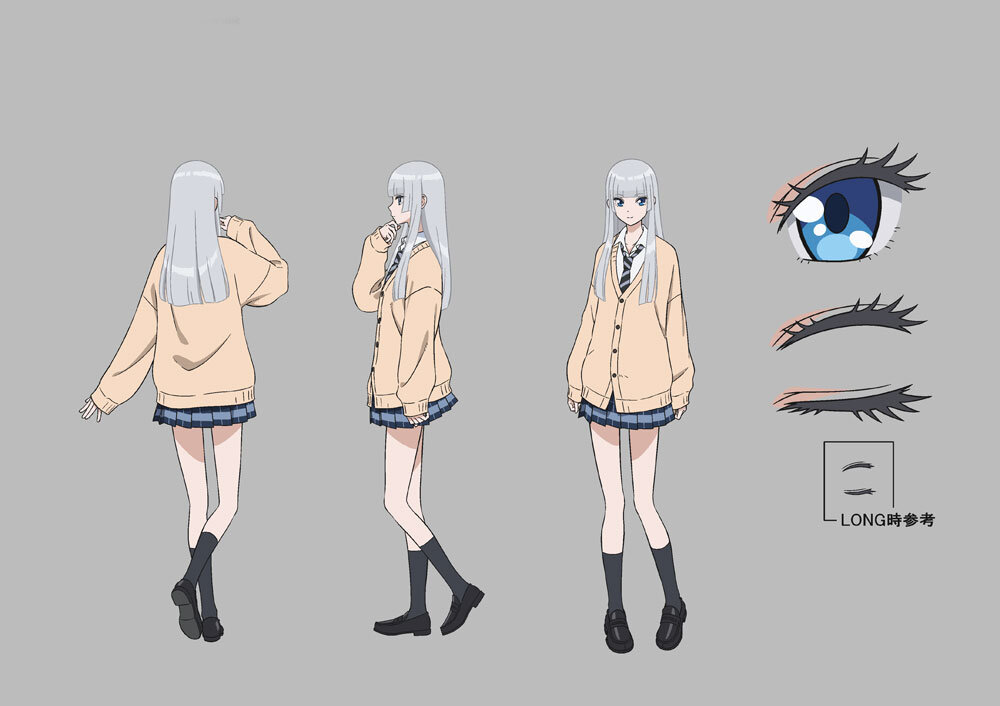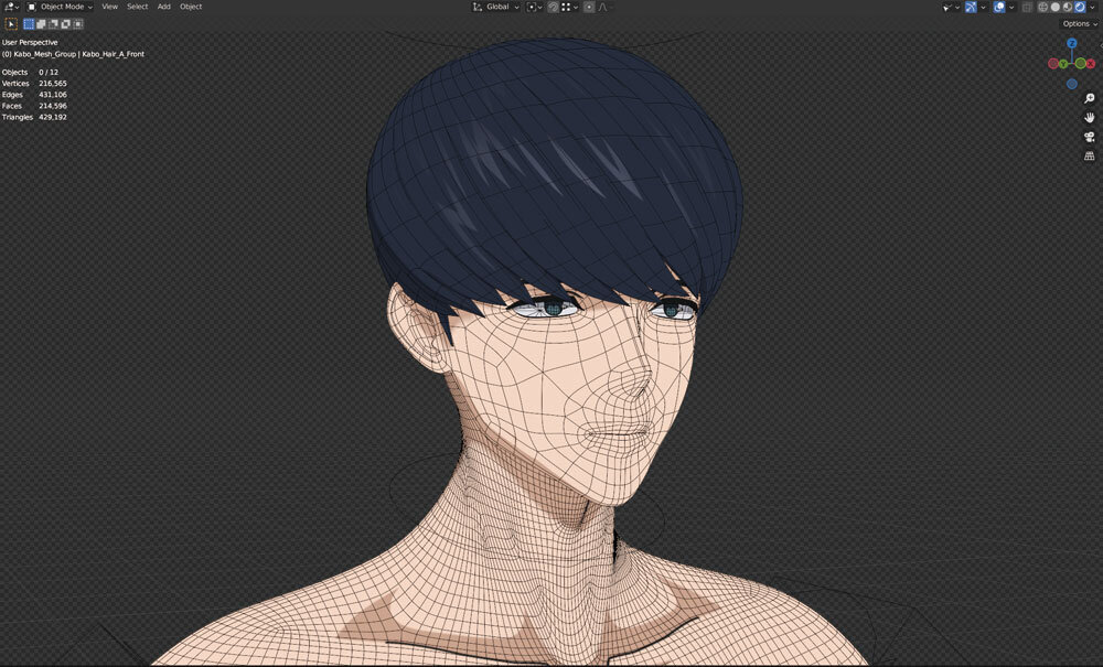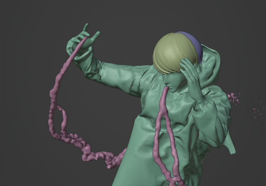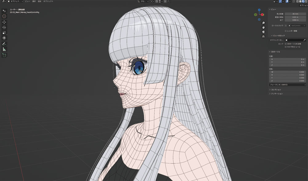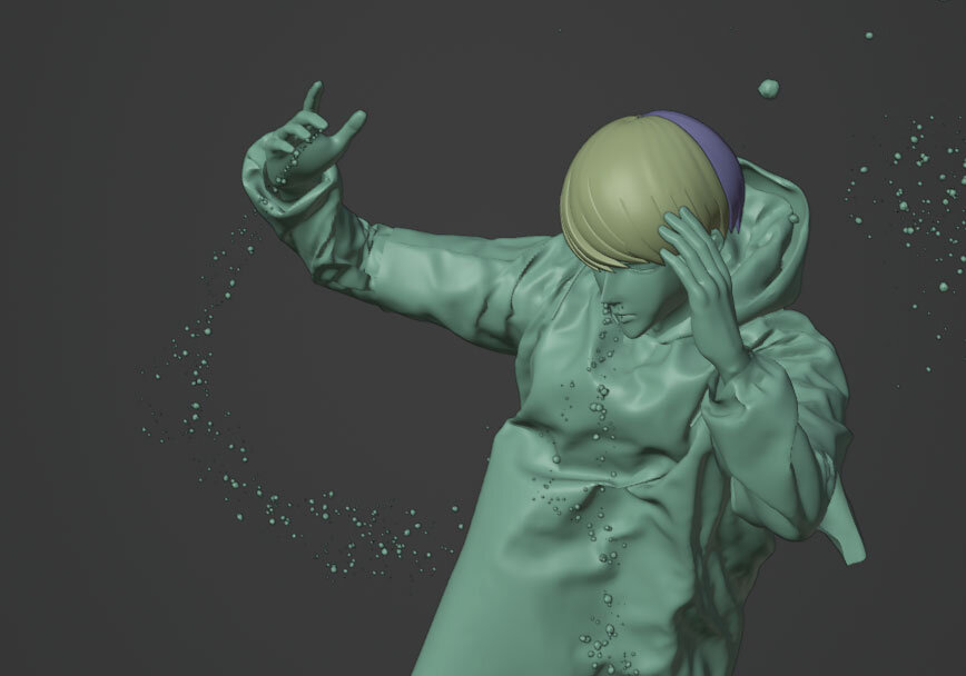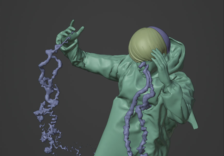 湾田のキャラクターモデル。湾田の髪の毛のみBlenderとMarvelous Designerのシミュレーションを併用している。ロングヘアが服と干渉するのを避けるためと、服の動きを髪に反映させるためだ。