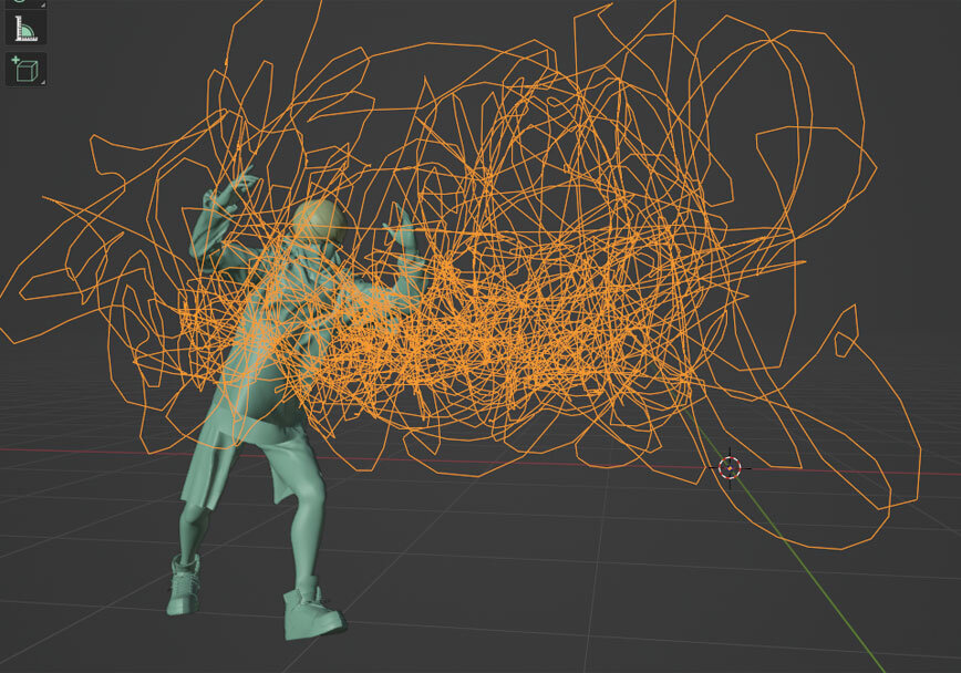 このメタボールベースのエフェクトは、モーションキャプチャの動きが基になっており、ここにも当初から唱えられていた「ダンサーの踊りが全ての起点にある」という理念が通底している。指の軌跡上にジオメトリノードを使用したもので、数値を変えるだけでほぼリアルタイムに調整できるという特長もある。