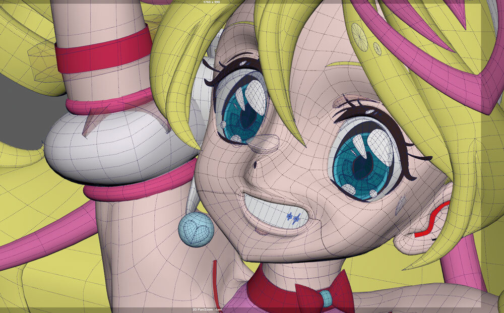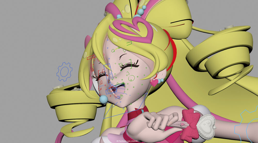 アニメーション付けについては前述の鄭氏に加え、可愛い表情が得意なCGアニメーターの髙橋七奈氏、揺れものと本編バンクを担当した、同じくCGアニメーターの高野伊織利氏に話を聞いた。髙橋氏は「可愛い表情をつくるために、パーツの位置にはこだわりました。鼻と口の間の人中の長さや、あごの長さ、比率を意識しています」と、コツを教えてくれた。