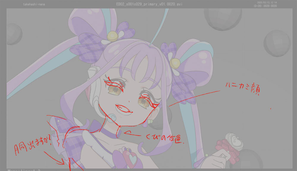 高野氏は作画出身のCGアニメーターのため、レンダリングされた連番の上から気になるところに自分で赤を入れて、その後、描かれた修正に合わせて3DCGを編集する、いわば「セルフリテイク」という手法を好んで使うという。これは作画ができる高野氏にしかできない手法だろう。