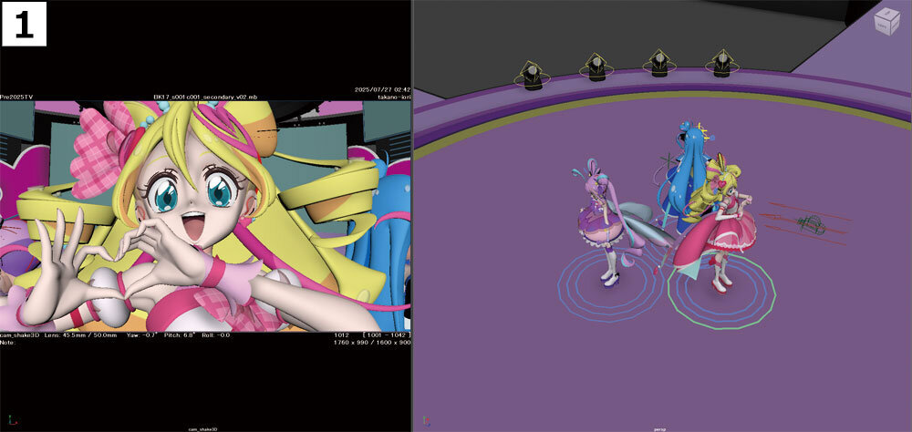 キュアアイドル、キュアウインク、キュアキュンキュンの3人ステージ技「プリキュア!ハイエモーション!」のバンクも高野氏が担当。それぞれがファンサする姿をカメラが追っていく。BGとカメラの位置関係など、初めに画的な嘘をつけない部分から固めてつくり始める。カメラは周りを回るリアルな軌道で3D空間を移動させている。