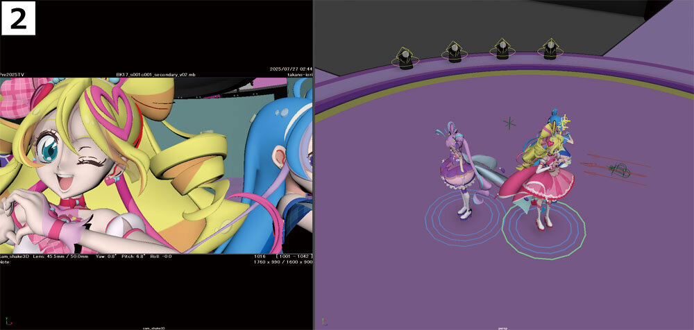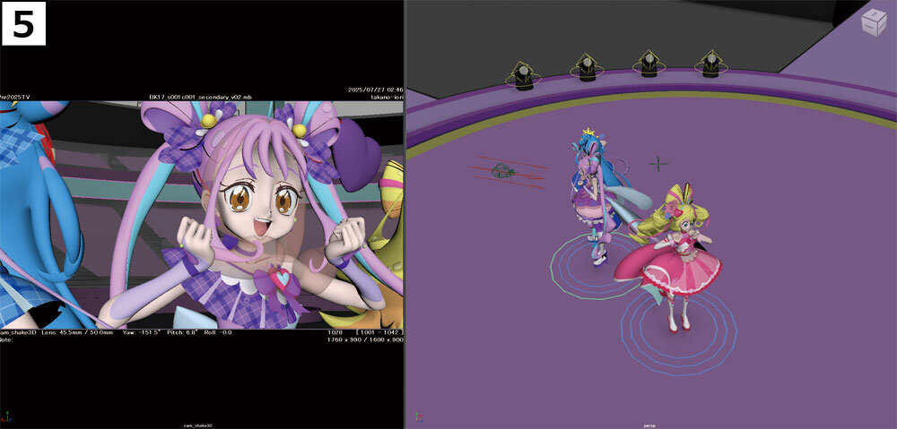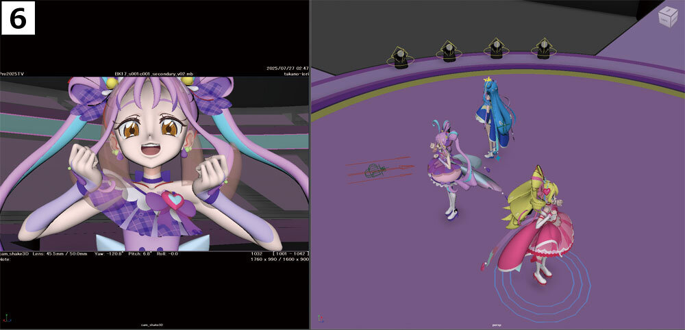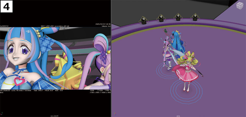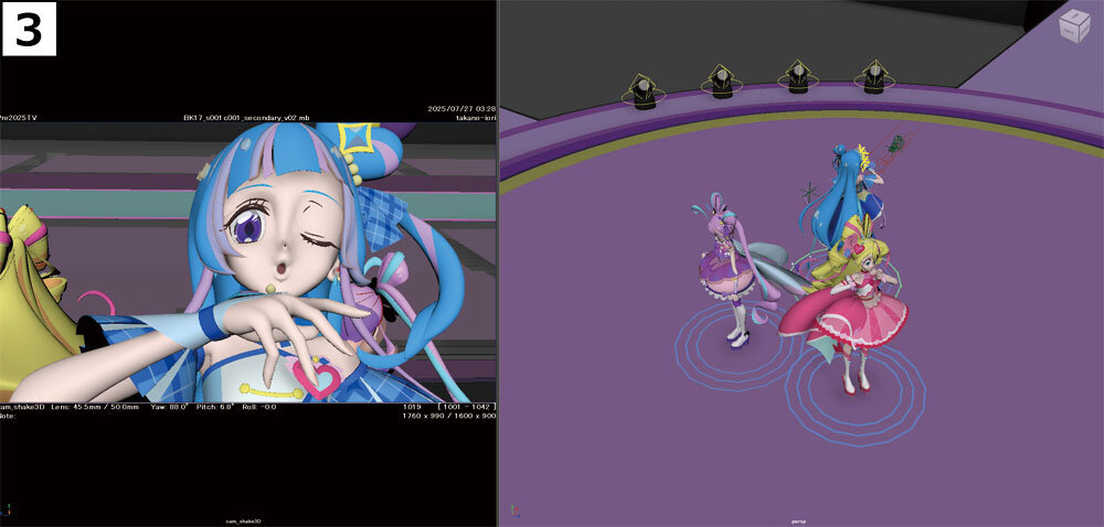 次に、キャラクターのアニメーションを加える。フレームごとに3人それぞれの立ち位置を調整し、気持ちの良いタイミングでアイドルたちが画面内を移動するような、画的に嘘をついた部分だ。あくまでもカメラから見て正常であれば、実際の立ち位置に固執する必要はないという。立っていてほしい位置にキャラクターを置くという、作画アニメーター的なアプローチだ。