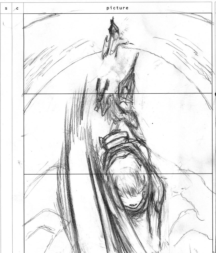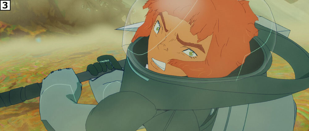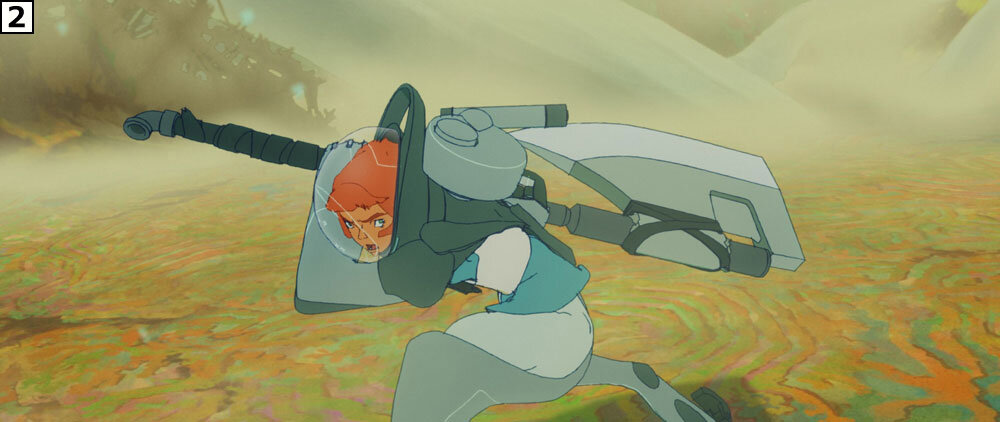 斧を使い、ギタイたちと戦うリタ。「このカットは始めからアニメーターが絵コンテの意図を丁寧に読みとってくれて、とても勢いと迫力のあるカットに仕上げてくれました。カット後半、こちらに迫ってくる鬼気迫るリタの表情が素晴らしいです」(秋本監督)。