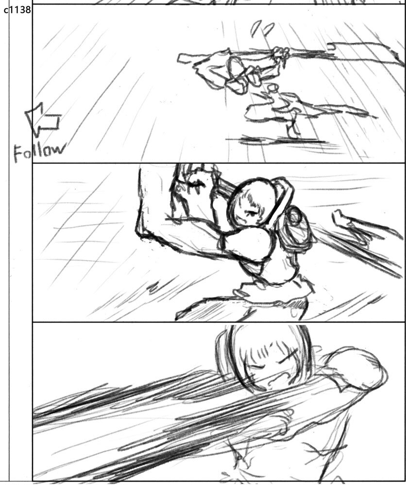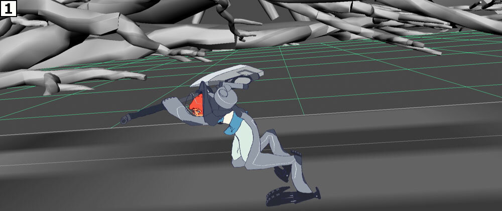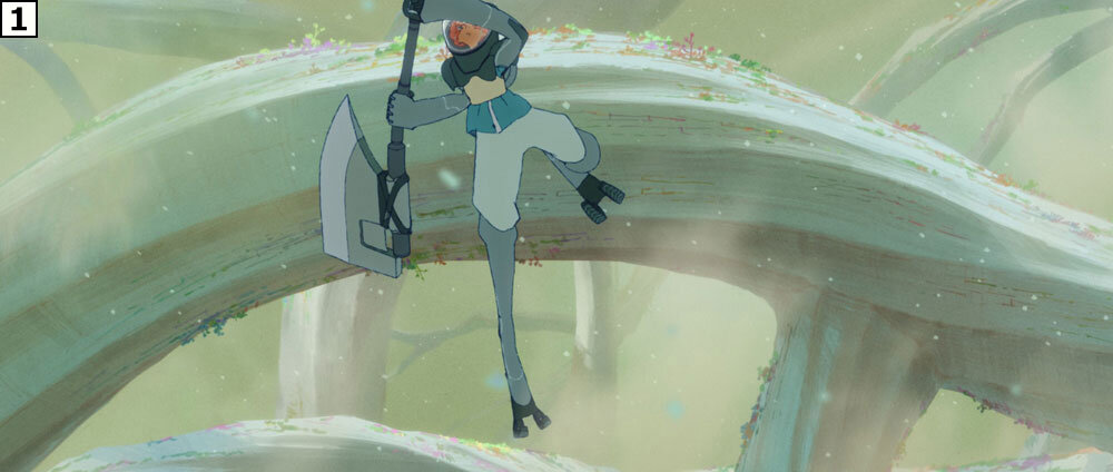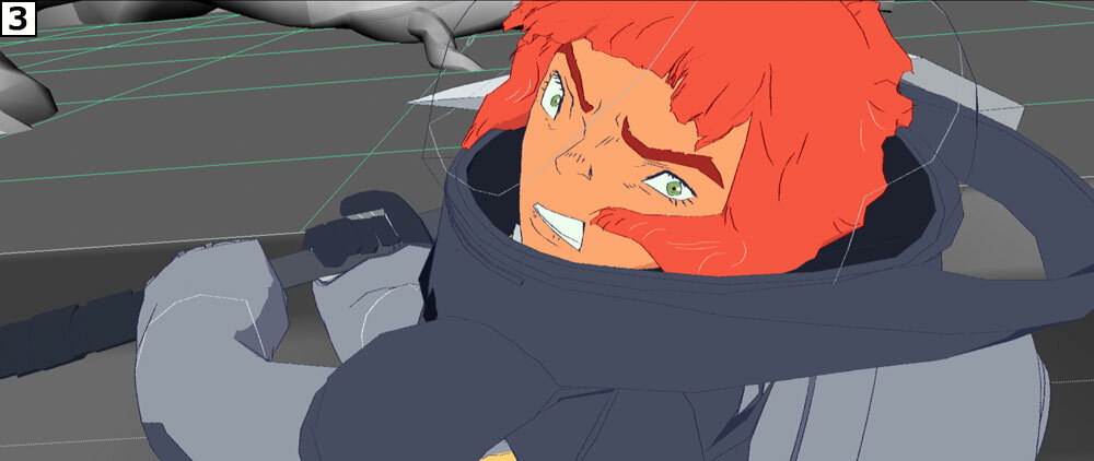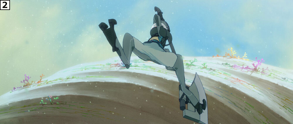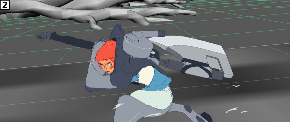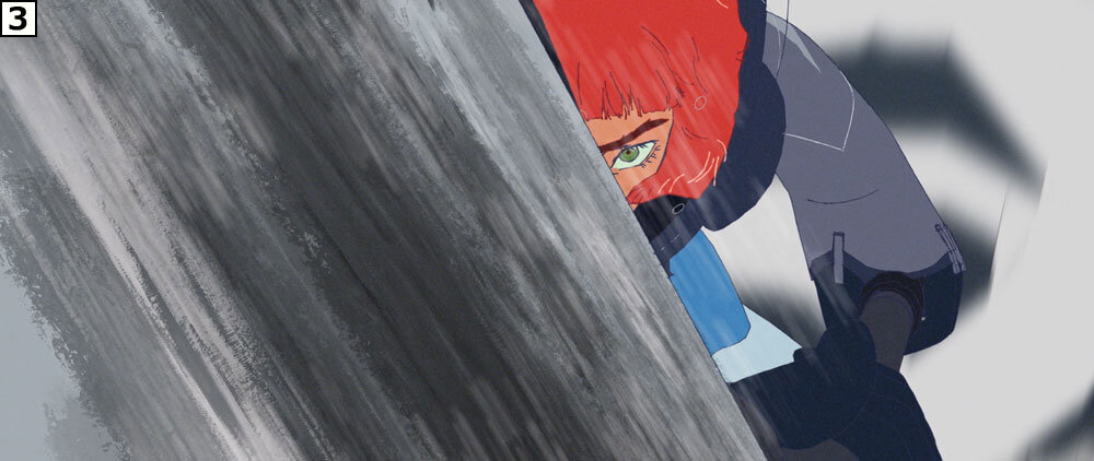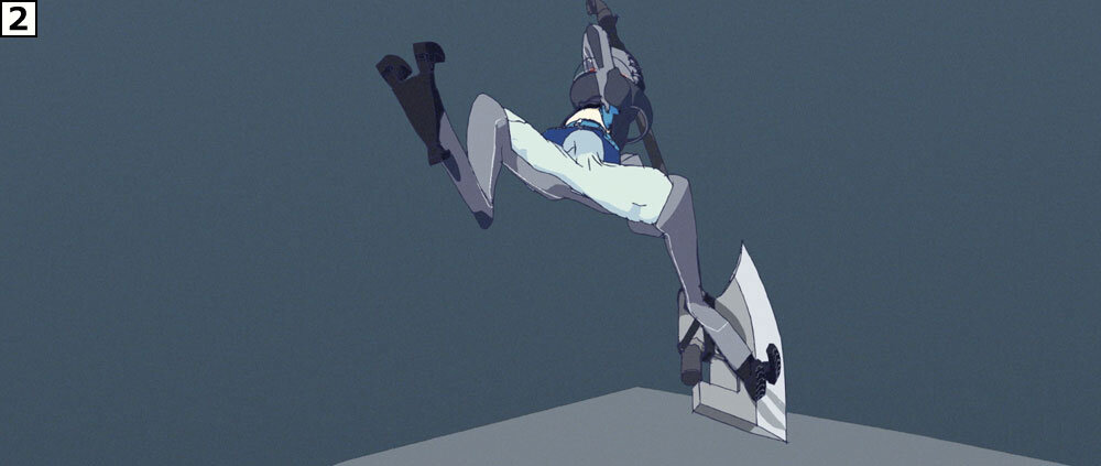 制作に際しては絵コンテのアップよりも先に、重要カットのテストを作成し、そこでチェックのフローを確認したり、動きやルックなどの表現要素を念入りに積み上げていった。「本カットはこれまで地上を駆けずり回って戦っていたリタが、ジャケットの性能をフルに活かし、人間離れした跳躍の後に力まかせに巨大な斧を叩きつけるという芝居内容ですが、これで本作のアクションの方向性を探りました。カートゥーンっぽい表現に偏りすぎず、かといってリアルになりすぎない。シルエットの誇張などのアニメーションとしての面白さは込めながら、重さは失わないという絶妙なバランスを保ちました」(秋本監督)。