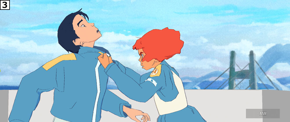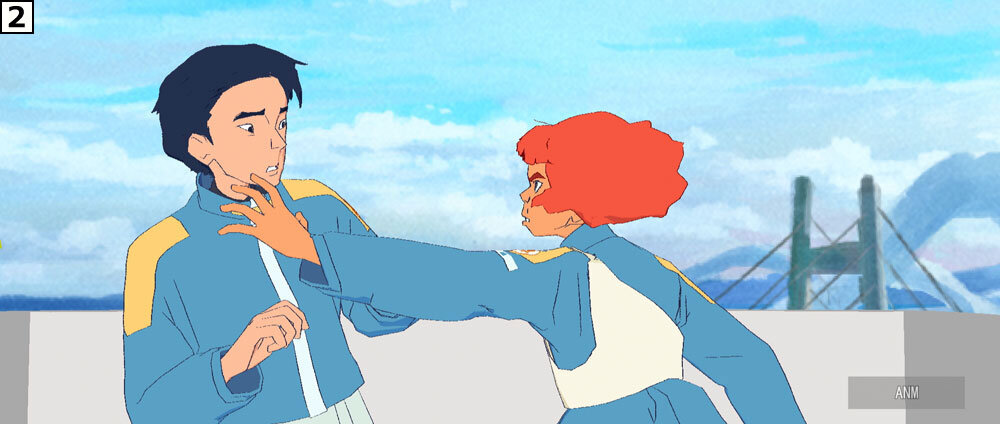 「襟を掴んで凄むというとても難しい芝居内容のカットです。CGアニメーションはとかくキャラクター同士の接触が難しいですが、基本のリグだけで見事に演技を付けてくれて驚きました。このカット前後のシーン一連、怒るリタと対照的に情けないケイジの表情と仕草がとても自然で、登場してすぐにケイジがどういう性格かがよくわかる芝居になっています」(秋本監督)。