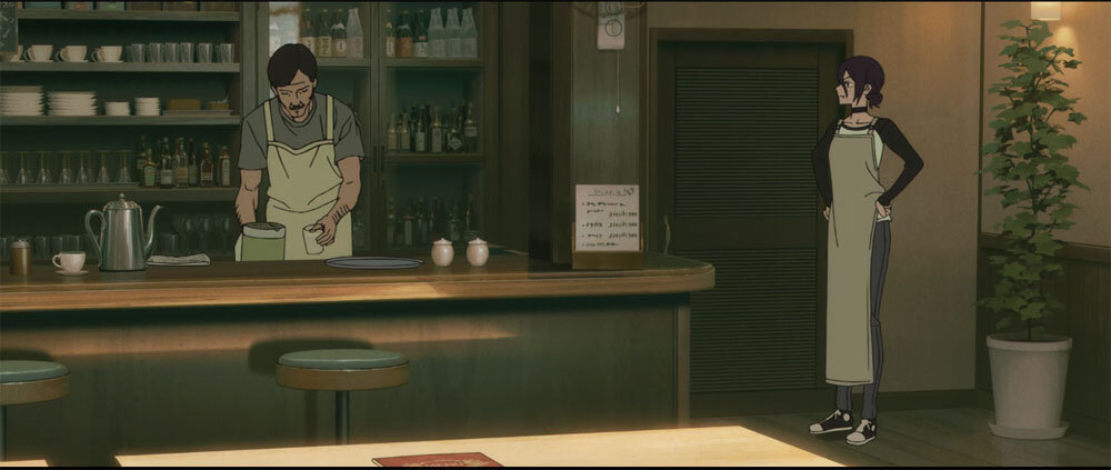 また「レゼ篇」の舞台のひとつであるカフェ「二道」は、登場シーンごとに時間帯が異なり、キャラクターに光が当たる方向も変化する。光源の設定も含めて、演出スタッフにリアルタイムでチェックしてもらうワークフローを組むことで、確認待ちによるタイムロスを防いだ。
