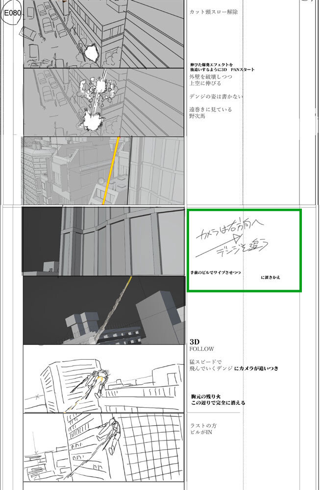 チェンソーマンが吹き飛ばされる約5秒のカットは、レイアウト段階でムービーを作成。チェンソーマンは作画に置き換わることを前提に、簡易的に色付きの陰影がついたプレビュー状態でチェックが行われた。