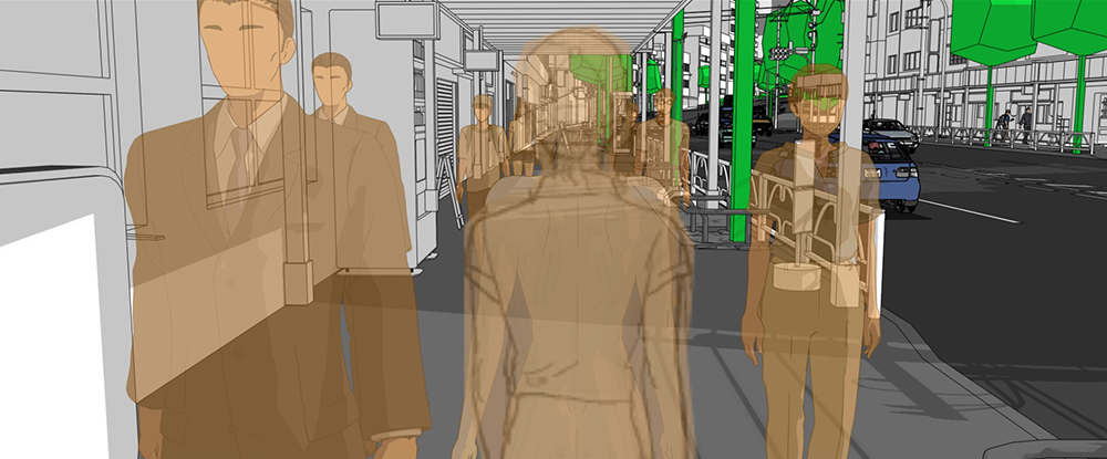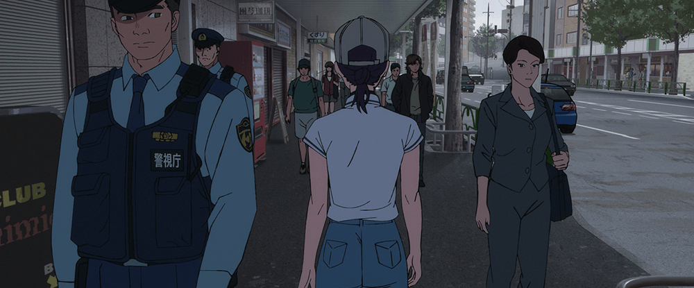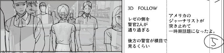 レゼが街中を歩いていく場面。地面が映った状態で複数の人物が画面の奥から手前に向かって歩いてくるというカットである。レゼに加えて、汎用のモブのCGモデルを配置。ムービーを作成して、アニメーターのガイドにも使用された。