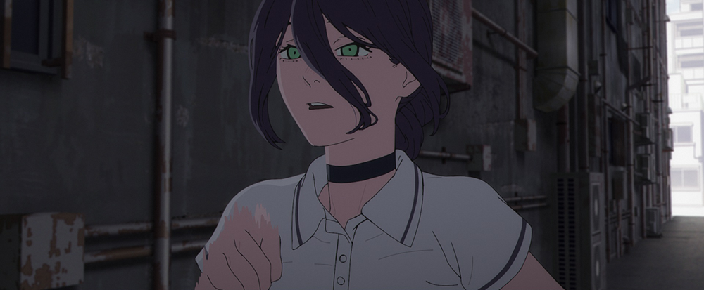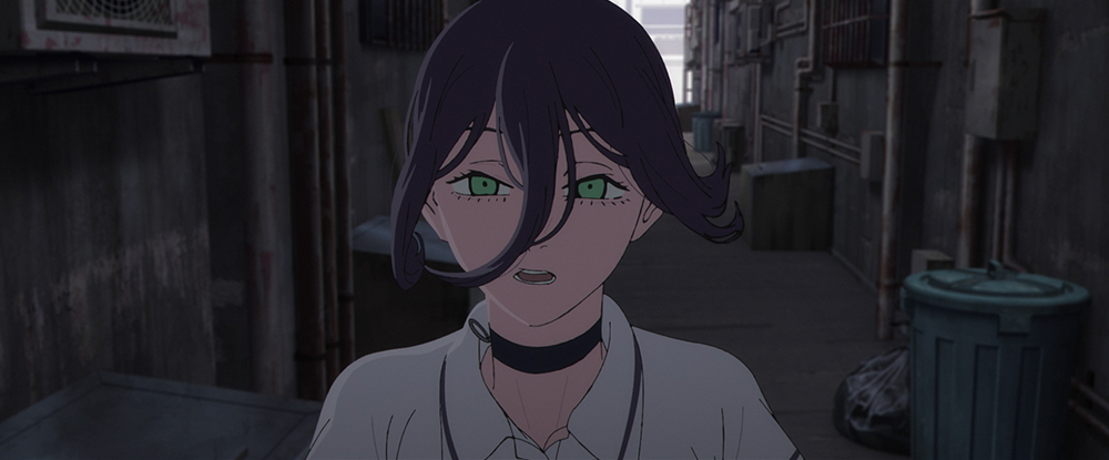 レゼがカフェ「二道」に向かう路地裏のカットでも、3Dレイアウトのムービーが作成された。最初は走るレゼを側面から捉え、そこからカメラが正面へ回り込む。背景美術の回り込みはカメラマップを用いて表現した。
