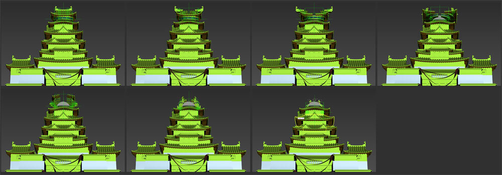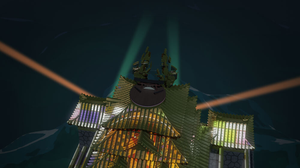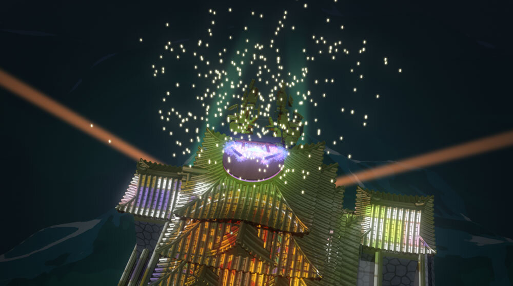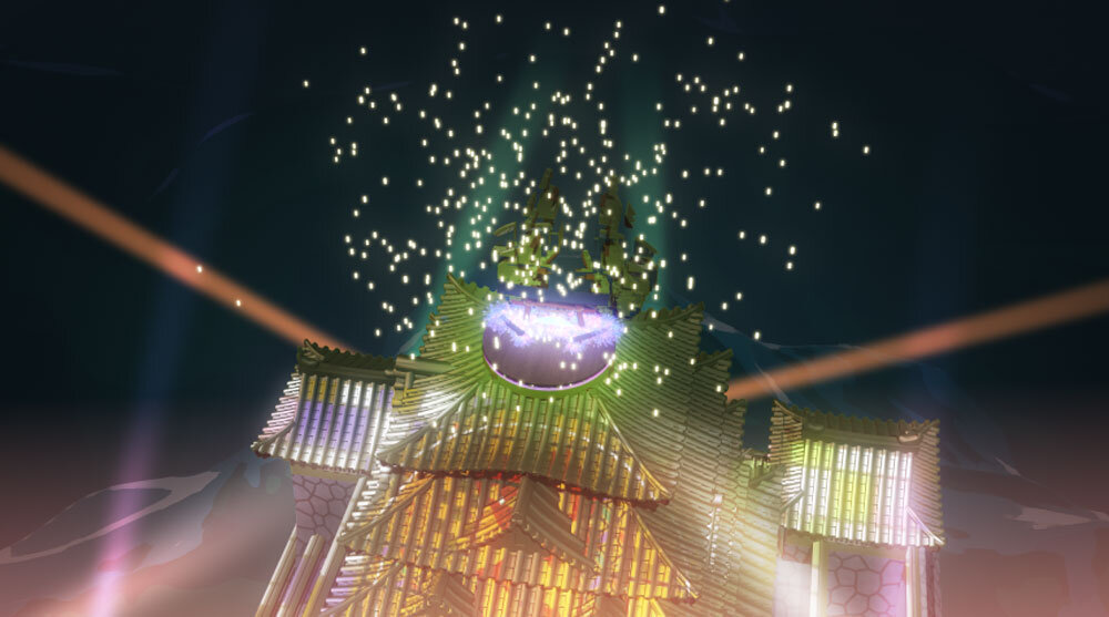 ライブステージの城が変形するカット。キューン・プラントから提供された城のモデルデータをスティミュラスイメージ側で3ds Max用に変換し、tyFlowを使って変形アニメーションが作成されている。カメラから見て破綻なく変形シークエンスを見せられるように、ケレン味を効かせた変形アニメーションを設定しているという。