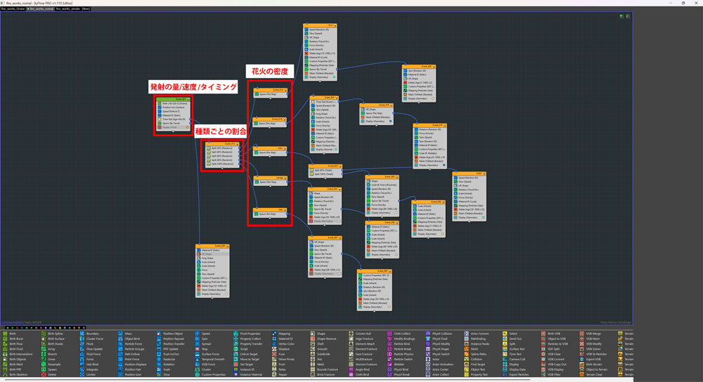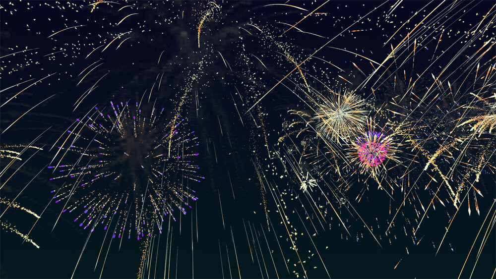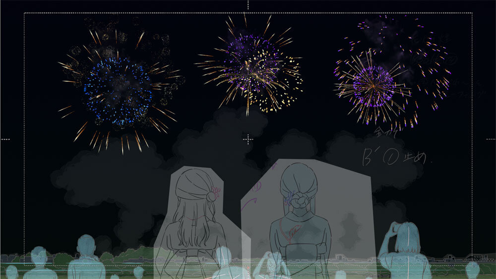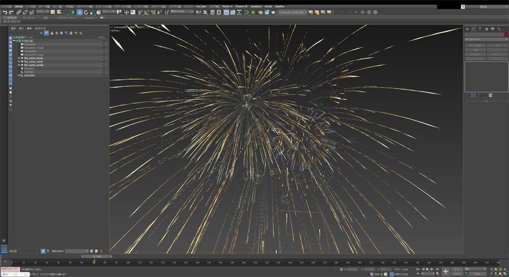 花火も印象的なエフェクトのひとつだ。これらの花火はスティミュラスイメージが本作用にtyFlowを使って花火ジェネレータを作成し、花火の種類や大きさ、打ち上げ時の速度など、演出に応じて細かく調整できるように設定されている。また、ドローンによる花火の空撮ショットもあるため、カメラからの距離に応じて花火にマイナススケールがかかるしくみも開発された。